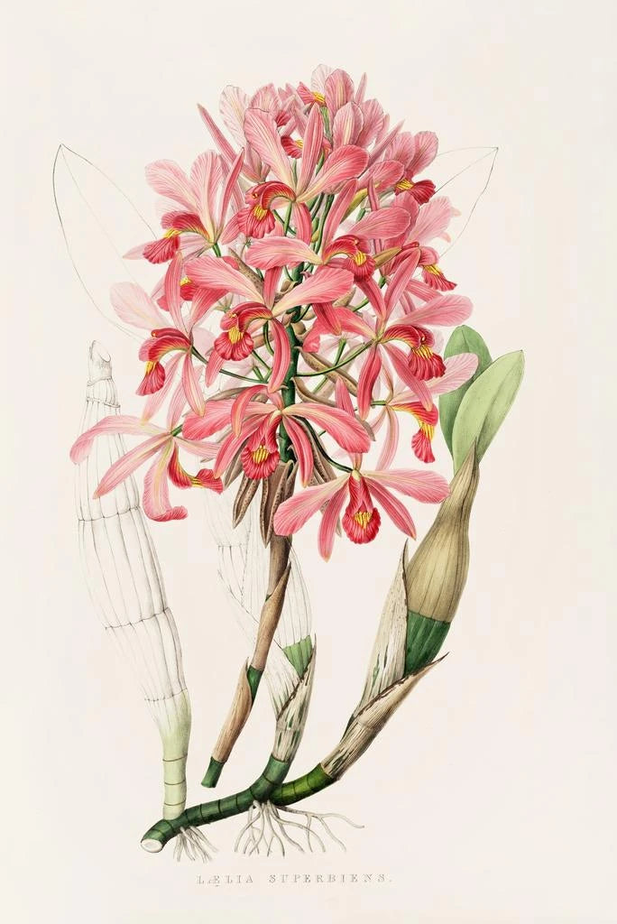 Laelia Superbiens, opera emblematico di James Bateman, si distingue per il suo splendore e la sua ricchezza cromatica. Questa tela presenta una composizione floreale rigogliosa, dove le sfumature vivaci di rosa, giallo e verde si mescolano armoniosamente. La tecnica dell'acquarello, utilizzata con maestria, permette di catturare la luce e la texture dei petali, creando un'atmosfera vibrante e gioiosa. Ogni fiore sembra prendere vita, invitando lo spettatore ad apprezzare la bellezza effimera della natura, celebrando al contempo la diversità delle specie vegetali.