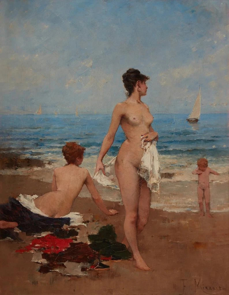 Francesc Miralles i Galaup, artista catalano del XIX secolo, è spesso riconosciuto per la sua capacità di unire realismo e impressionismo. La sua carriera è segnata da una costante ricerca di bellezza e armonia, temi che risuonano profondamente in "Les Baigneuses". Influenzato dai grandi maestri della sua epoca, Miralles ha saputo sviluppare uno stile personale che gli permette di affermarsi nel mondo dell'arte. La sua opera, spesso ispirata dalla natura e dalla vita quotidiana, riflette una sensibilità unica che tocca il cuore degli spettatori. Attraverso le sue pitture, invita a una riflessione sulla condizione umana, sulla bellezza effimera dei momenti semplici e sulla magia delle interazioni umane. L'impatto del suo lavoro si fa sentire oltre la sua epoca, ispirando molti