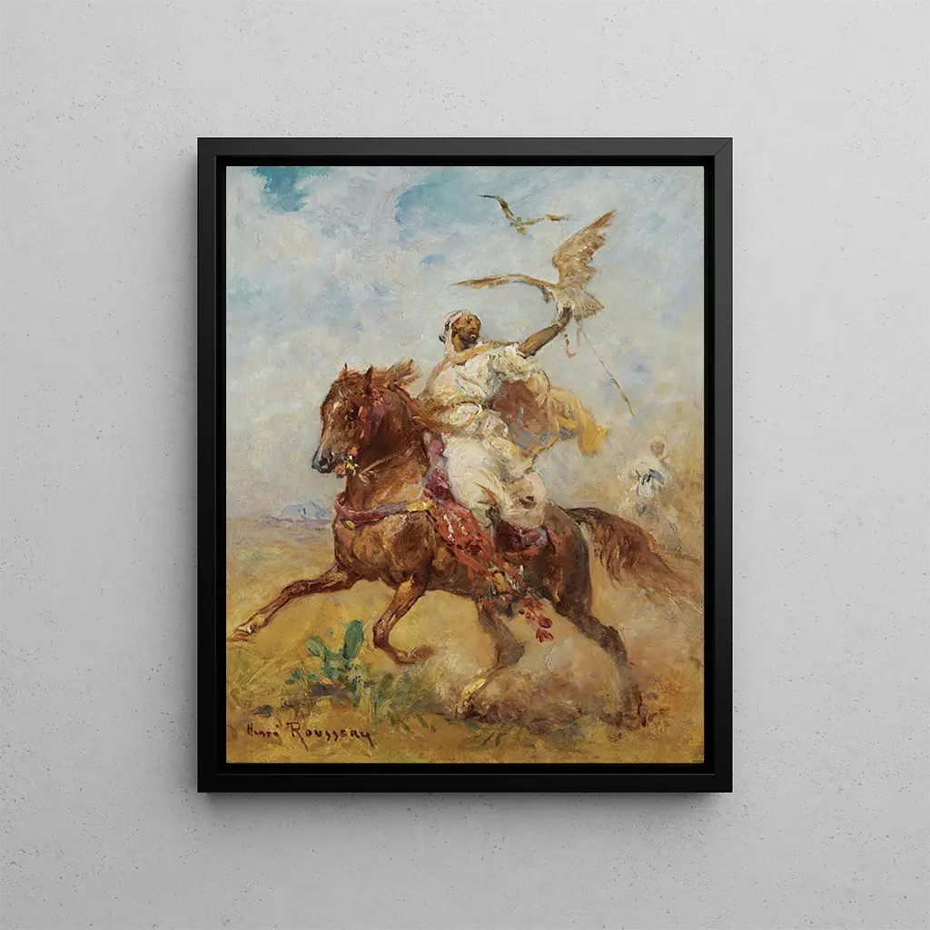 In "Le fauconnier", Henri Émilien Rousseau ci immerge in un'atmosfera intrisa di nobiltà e tradizione. La tela raffigura un uomo in abiti d'epoca, con un falco sulla mano, simbolo di caccia e maestria. I colori ricchi e profondi, che vanno dai toni terrosi ai verdi lussureggianti, creano un'armonia visiva affascinante. La tecnica di Rousseau, che combina realismo e tocchi impressionisti, dà vita a ogni dettaglio, dal piumaggio dell'uccello alle texture dei vestiti. Quest'opera invita alla contemplazione, evocando un mondo in cui l'uomo e la natura coesistono in perfetta simbiosi.