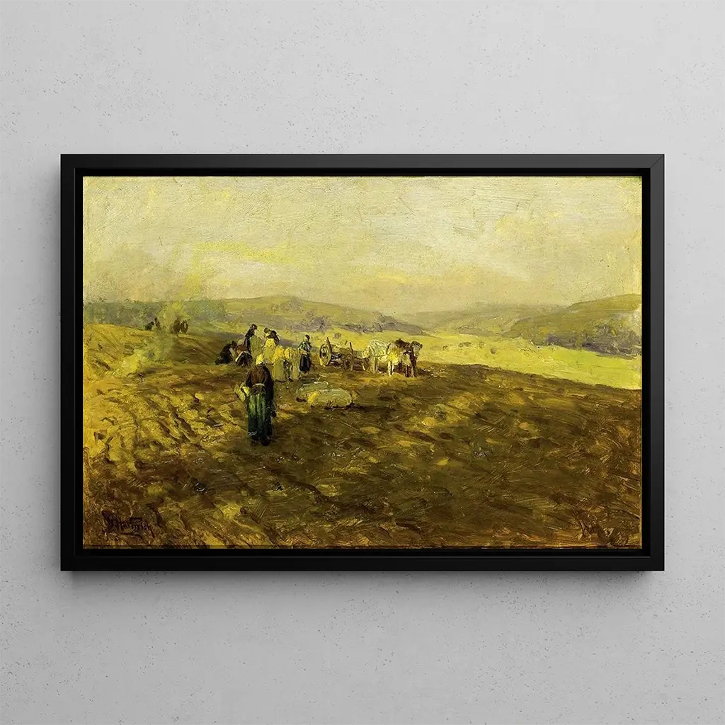 La stampa d'arte di Les glaneuses de pommes de terre ci trasporta in un quadro intriso di realismo e semplicità. I colori terrosi, mescolando sfumature di marrone e verde, evocano il lavoro dei contadini nei campi. La tecnica della pittura ad olio permette di rendere con precisione le texture degli abiti e degli elementi naturali. L'atmosfera che si sprigiona da questa opera è allo stesso tempo malinconica e piena di dignità, mettendo in luce la vita delle glaneuses, figure spesso dimenticate dalla società.