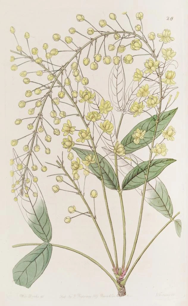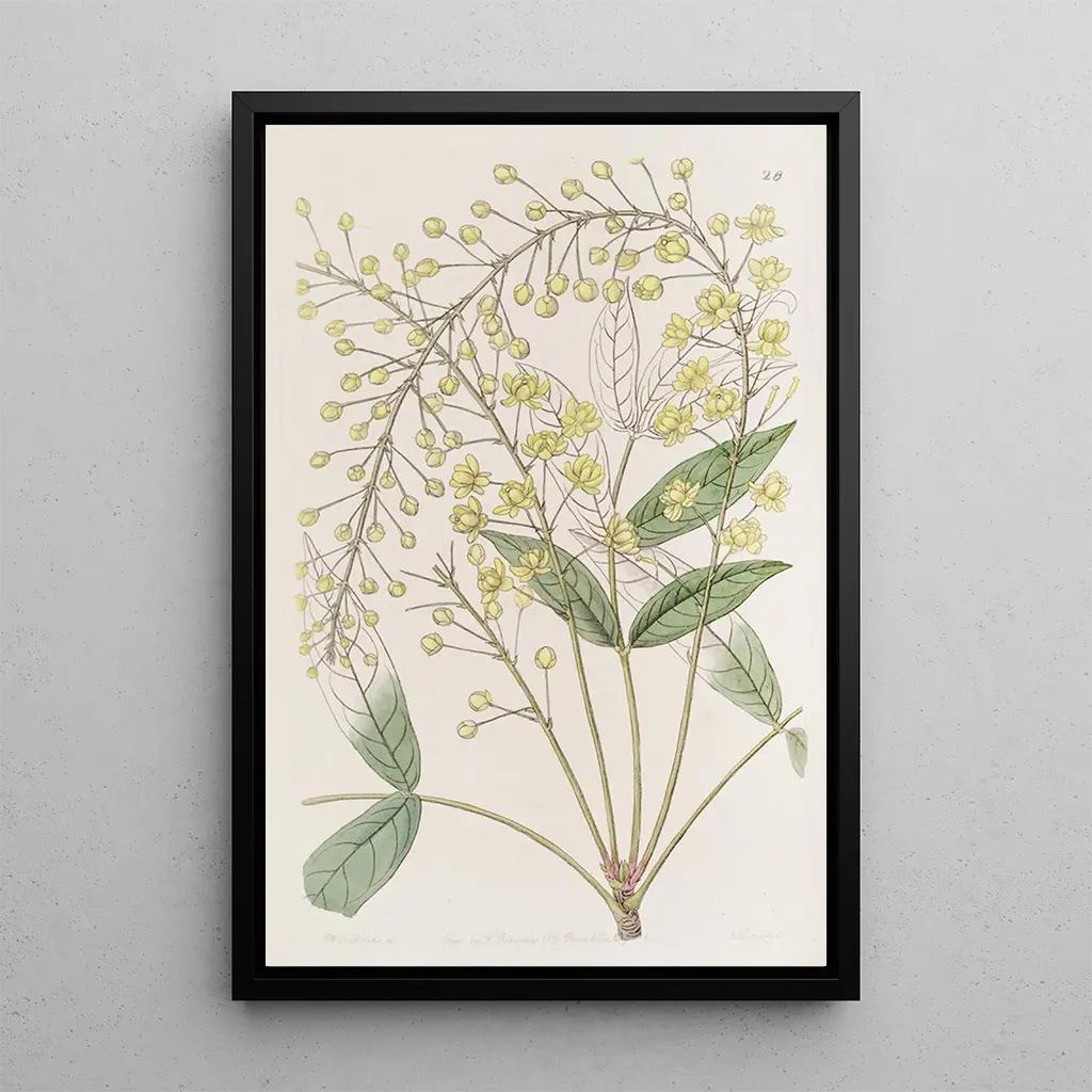 L'épine-vinette à feuilles de frêne fines, avec ses teintes vibrantes et ses forme délicates, évoque une nature à la fois sauvage et maîtrisée. Questa opera di Sydenham Edwards, famoso per le sue illustrazioni botaniche, cattura l'essenza stessa di questa pianta. I colori ricchi, che vanno dal verde profondo alle sfumature dorate, si mescolano armoniosamente per creare un'atmosfera vivace. La tecnica ad acquerello utilizzata dall'artista permette di rendere ogni dettaglio con una precisione sorprendente, dando vita a questa epine-vinette, come se fosse pronta a sbocciare sotto i nostri occhi.