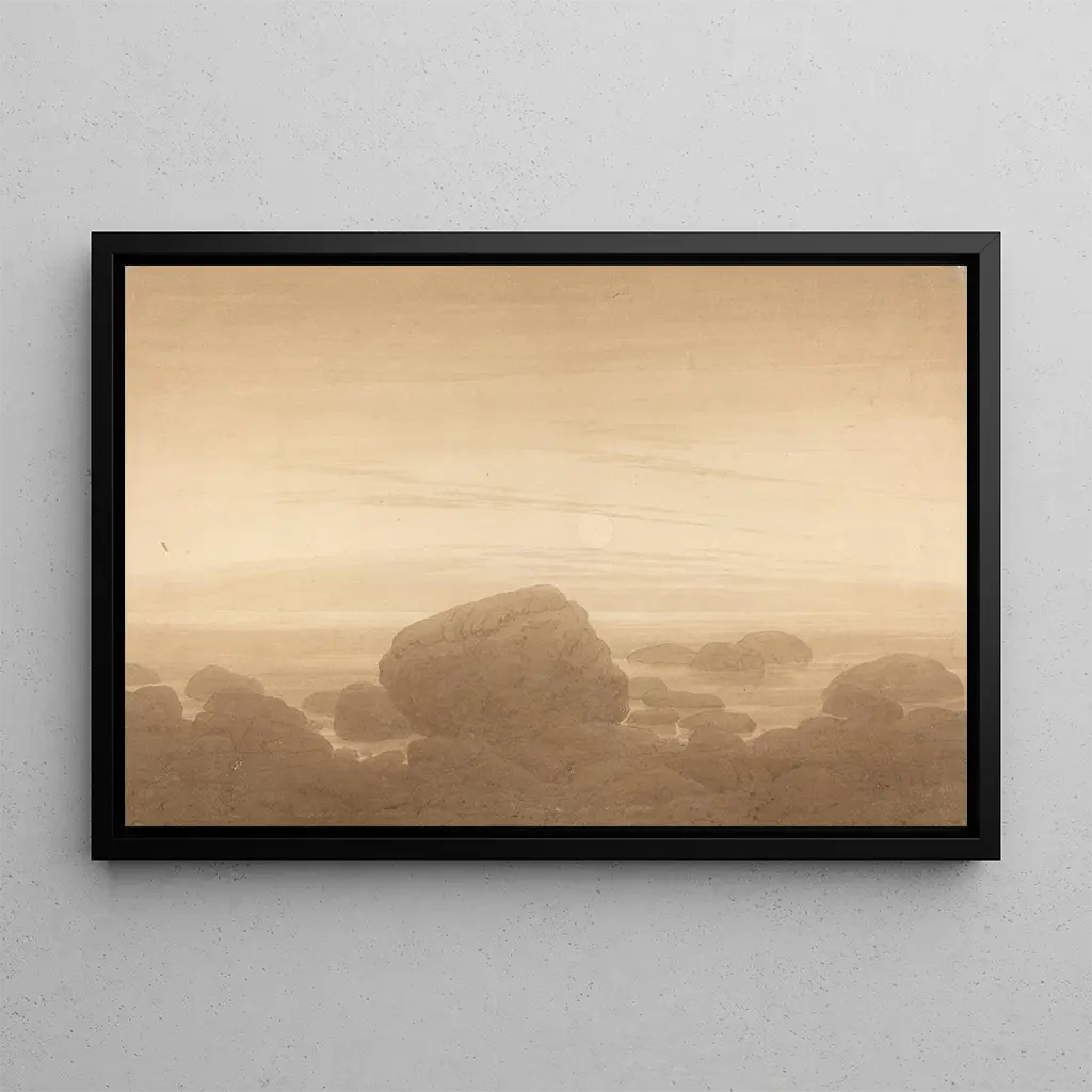 La stampa d'arte de Lever de lune sur une rive solitaire, réalisée par Caspar David Friedrich, nous transporte dans un univers empreint de mystère et de contemplation. La scène nocturne, illuminée par la douce lumière de la lune, crée une atmosphère à la fois sereine et mélancolique. Les teintes sombres du ciel contrastent avec les reflets argentés sur l'eau, tandis que la silhouette d'un arbre solitaire évoque la solitude. Cette œuvre invite à la réflexion, permettant au spectateur de ressentir l'émotion profonde qui émane de ce paysage romantique.