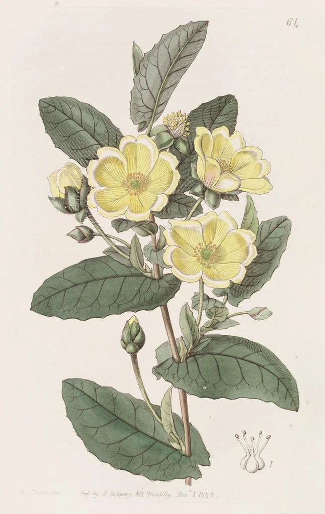 L'hibbertia Thoroughwax, con i suoi petali brillanti e la sua struttura delicata, è un'opera che celebra la bellezza dei fiori. Sydenham Edwards, attraverso la sua maestria nell'acquarello, riesce a catturare la luce e la texture di questa pianta unica. Le sfumature di giallo e verde si mescolano per creare una composizione armoniosa, invitando lo spettatore a immergersi in un mondo floreale vibrante. Ogni dettaglio è accuratamente reso, offrendo un'atmosfera al tempo stesso rilassante e ispirante, come una passeggiata in un giardino rigoglioso.