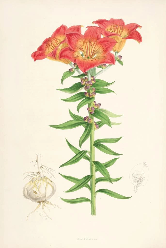 Walter Hood Fitch, attivo nel XIX secolo, è riconosciuto come uno dei più grandi illustratori botanici della sua epoca. Il suo lavoro è stato influenzato dalle scoperte scientifiche del suo tempo, in cui lo studio delle piante e dei fiori assumeva un'importanza crescente. Fitch ha saputo unire rigore scientifico ed estetica, permettendogli di creare opere che sono sia informative che visivamente affascinanti. Le sue illustrazioni, tra cui Lilium bulbiferum, sono diventate riferimenti nel campo della botanica, testimonianza dell'importanza dell'arte nella diffusione delle conoscenze scientifiche.