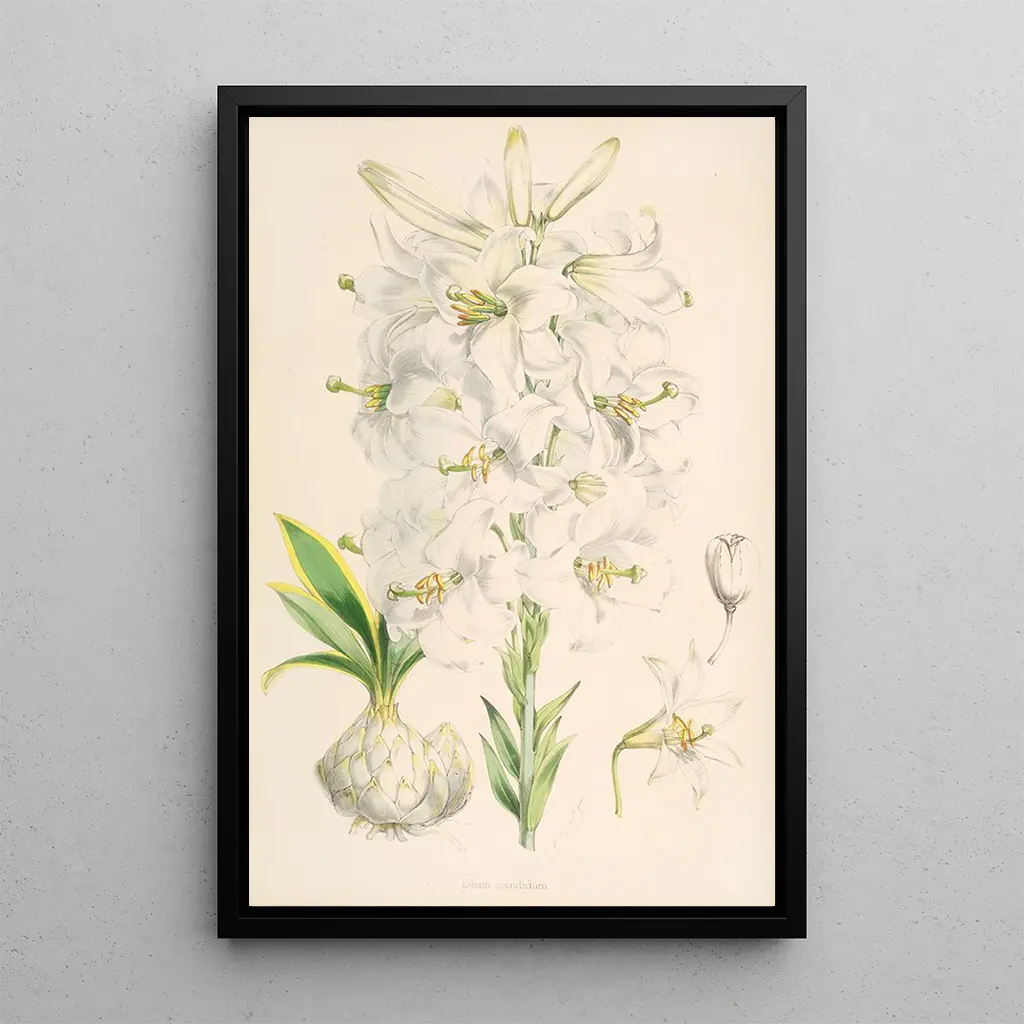 Walter Hood Fitch, botanico e illustratore britannico del XIX secolo, ha segnato la sua epoca con rappresentazioni precise e poetiche della flora. Influenzato dal movimento vittoriano e dall'espansione della botanica, Fitch ha collaborato con numerosi scienziati per illustrare opere di riferimento. Il suo lavoro non solo ha contribuito alla documentazione delle specie vegetali, ma ha anche elevato l’arte dell’illustrazione botanica a un livello di raffinatezza senza pari. Lilium candidum è un esempio perfetto del suo talento, combinando rigore scientifico e sensibilità artistica.