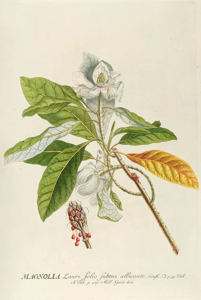Georg Dionysius Ehret, attivo nel XVIII secolo, è considerato uno dei pionieri della stampa d'arte botanica. Il suo lavoro, caratterizzato da uno stile barocco, unisce precisione scientifica e sensibilità artistica. Ehret è stato influenzato dalle scoperte botaniche della sua epoca e ha collaborato con numerosi botanici, contribuendo alla documentazione delle specie vegetali. La sua capacità di catturare la bellezza delle piante lo ha reso una figura emblematica nel mondo dell'arte e della scienza, e le sue opere, tra cui Magnolia, continuano a ispirare gli appassionati d'arte e di natura.