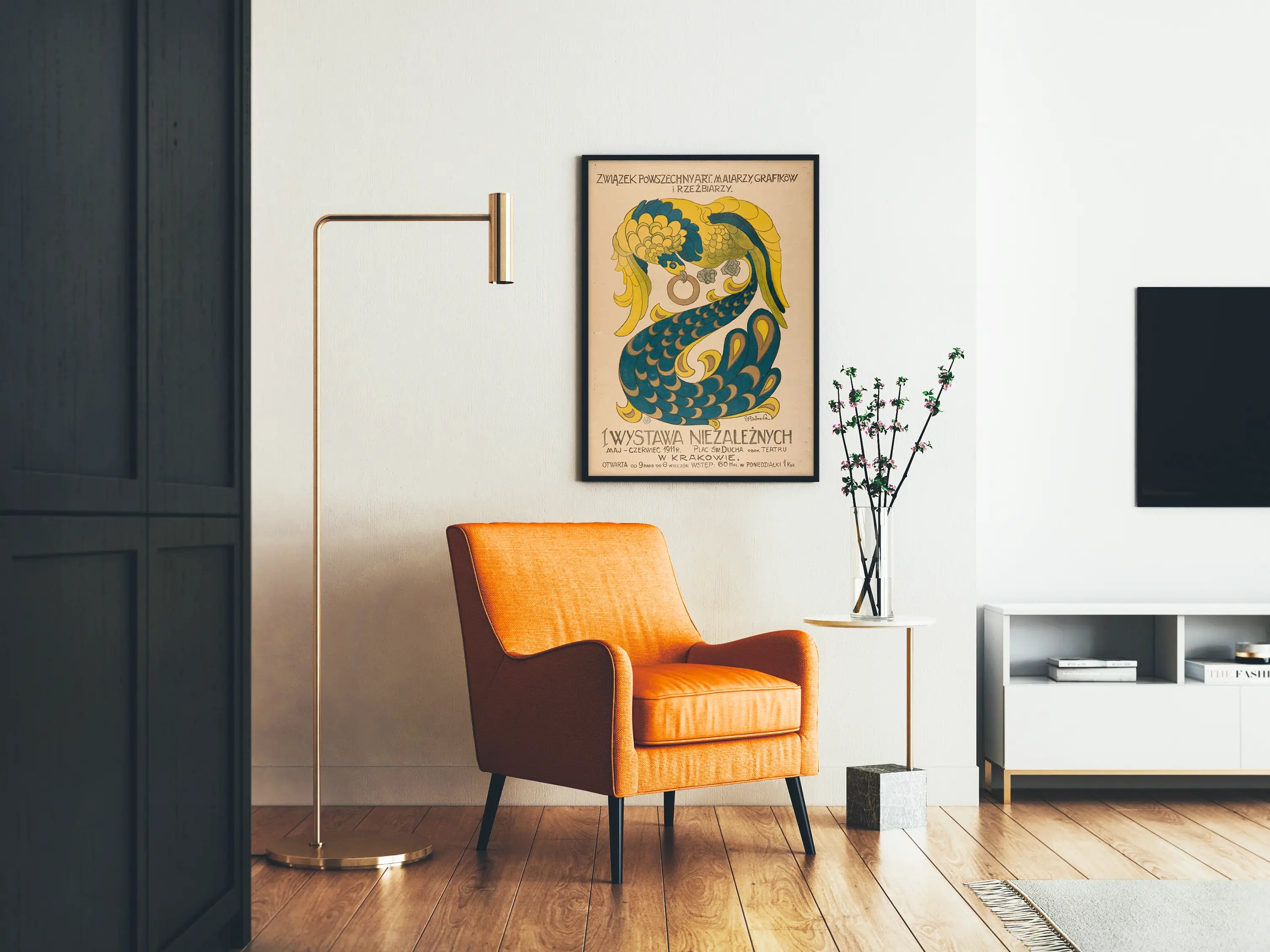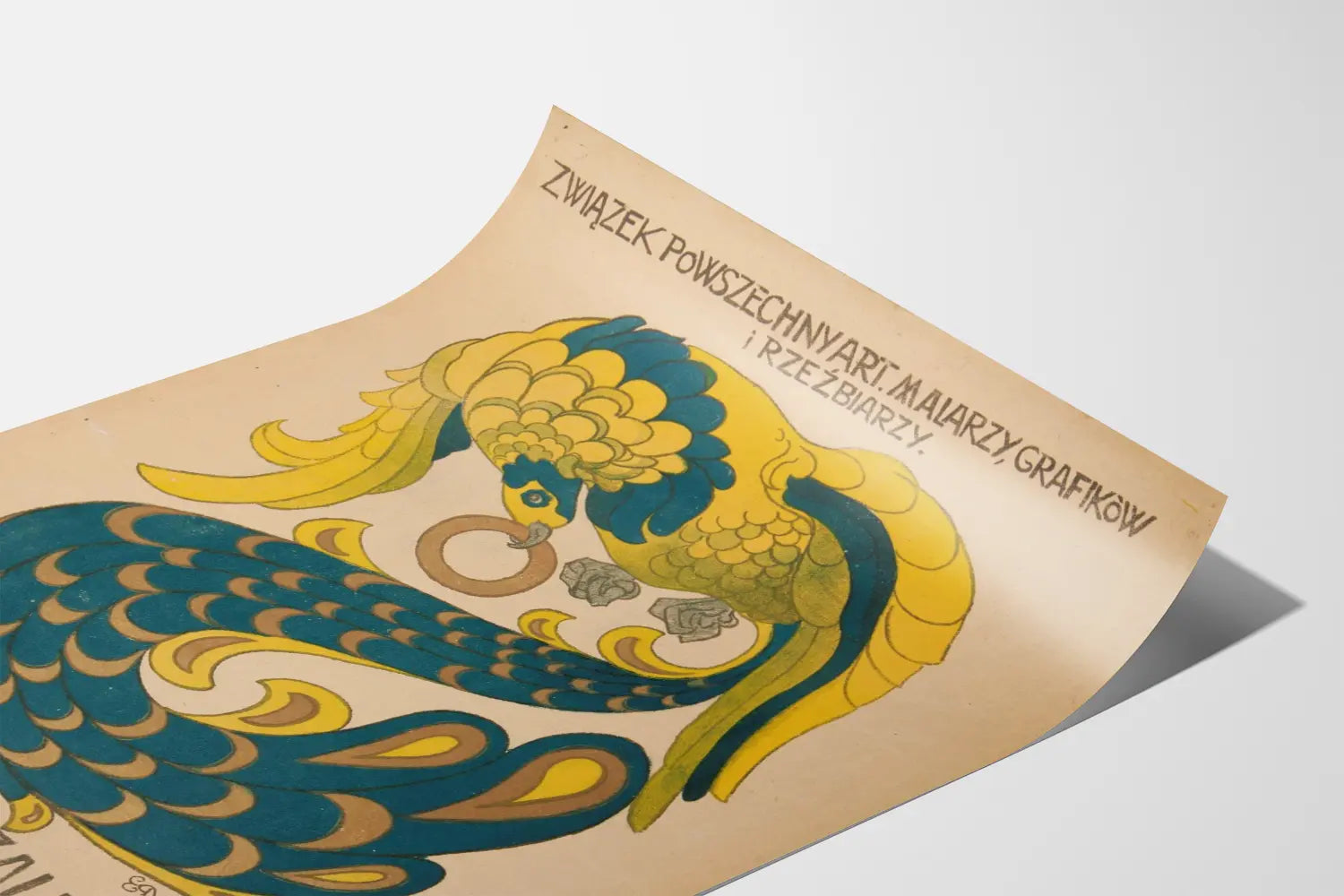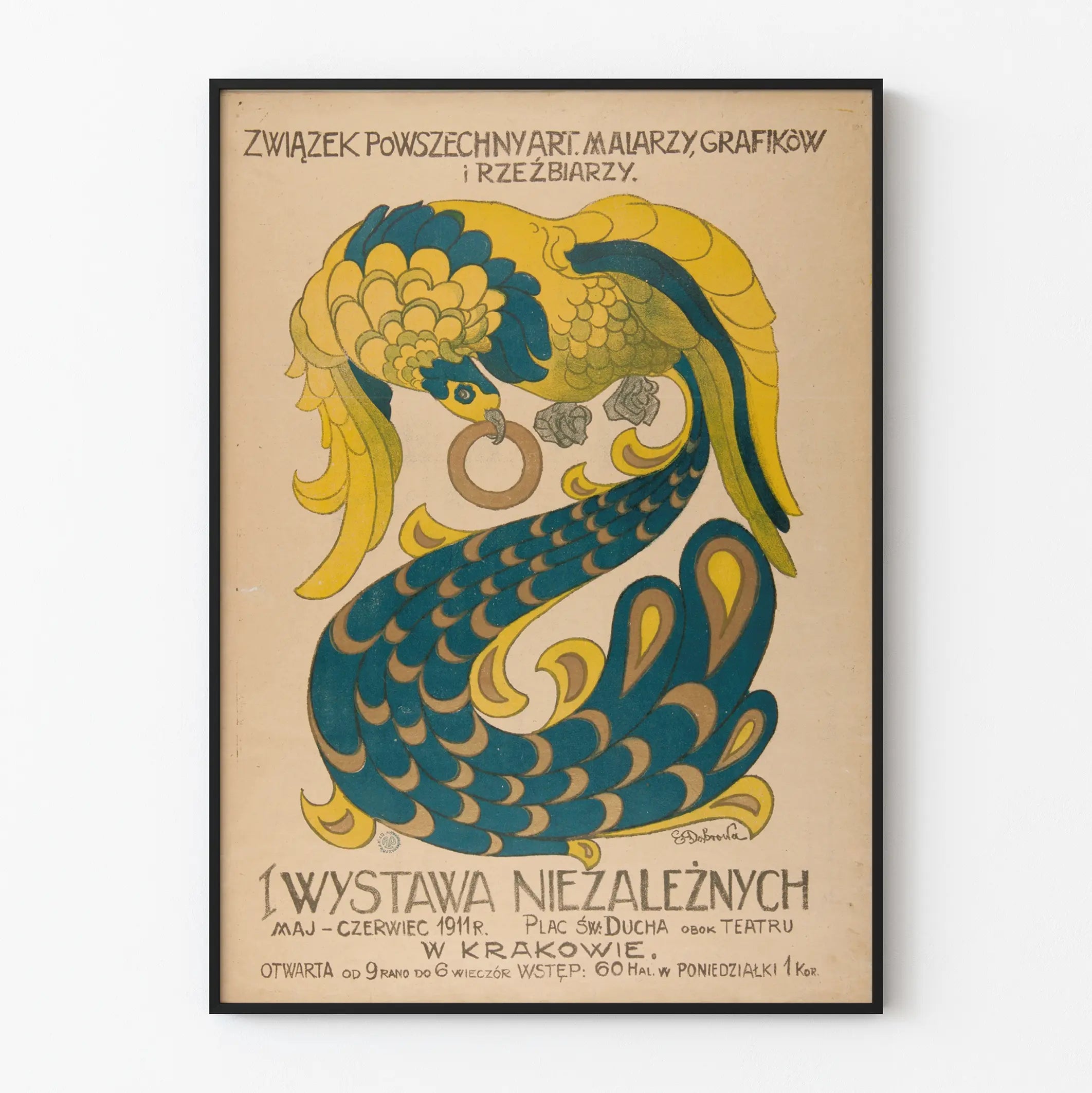 Questa locandina vintage rappresenta un'opera tipica dell'Art Déco, raffigurante un uccello stilizzato dai colori giallo, blu e verde, realizzato con forme geometriche e motivi organici che invitano a una decorazione murale raffinata. Annuncia la prima esposizione di artisti indipendenti organizzata a Cracovia nel 1911, riunendo pittori, grafici e scultori, distinguendosi per il suo design grafico unico e la sua estetica antica che richiamano la storia dell'arte polacca.