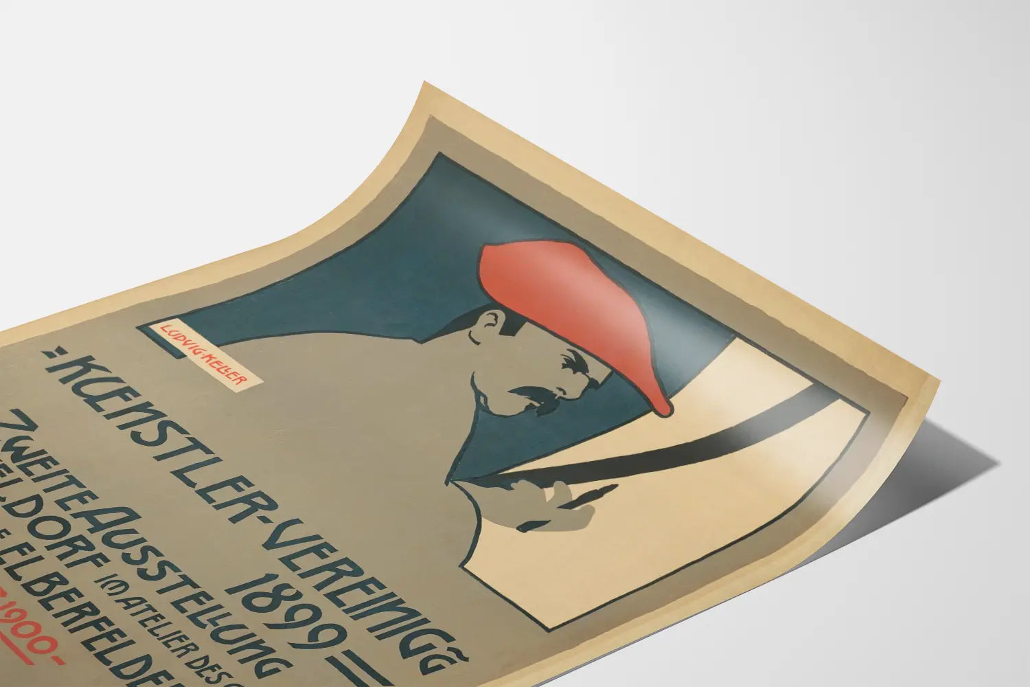 Questa stampa d'arte vintage rappresenta un'opera tipica dello stile grafico della fine del XIX secolo, annunciando la seconda esposizione dell'Associazione degli Artisti a Düsseldorf nel 1899. La composizione mette in evidenza un ritratto stilizzato di un uomo con berretto rosso, che tiene un pennello, evocando l'universo della pittura e dell'arte. Il suo volto è disegnato in profilo, con tratti semplici ma espressivi, su uno sfondo dai colori sobri che variano tra grigio, blu scuro e beige. Una tipografia audace e angolare occupa la parte inferiore della stampa, combinando lettere nere e tocchi rossi, catturando immediatamente lo sguardo. Questo poster promozionale d'epoca è un elemento chiave per ogni decorazione murale ispirata all'arte e alle esposizioni antiche. Che sia per un salotto, uno studio o uno spazio creativo, apporta un tocco di autenticità e un fascino rétro unico. La stampa si distingue per il suo aspetto grafico, caratterizzato da un equilibrio tra forme geometriche e linee semplici. Perfetta come stampa incorniciata o poster da parete, questa immagine si integra idealmente in uno stile di decorazione vintage, industriale o artistico. Rappresenta anche un omaggio alla storia delle esposizioni d'arte e alle tecniche di stampa dell'epoca, arricchendo così la tua collezione di decorazioni murali con un vero pezzo di storia visiva. Scegliere una riproduzione di questa stampa permette di aggiungere un tocco culturale ed estetico, valorizzando un design grafico antico che rimane moderno ed elegante in un ambiente contemporaneo.