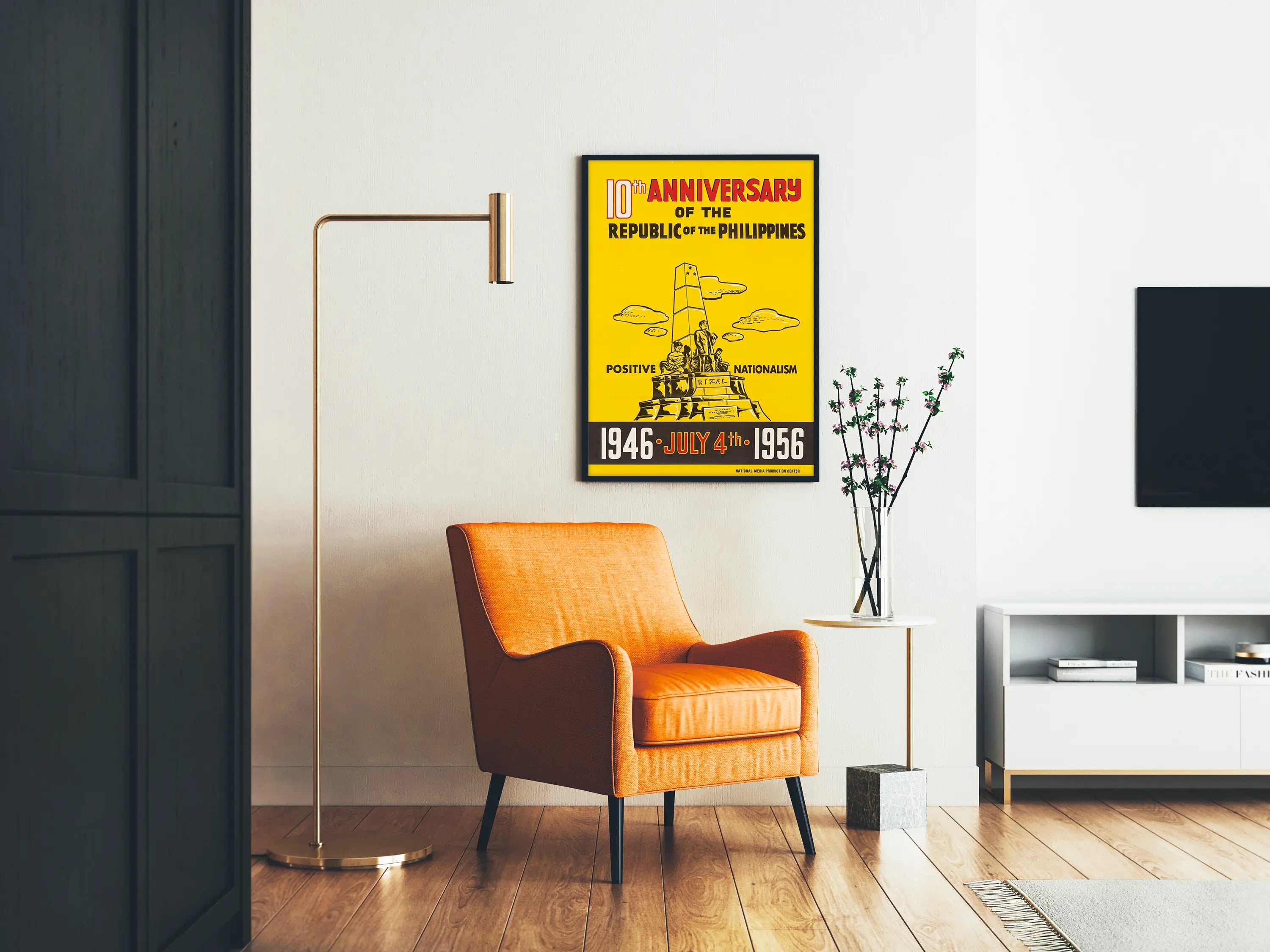 Questo poster vintage celebra il decimo anniversario della Repubblica delle Filippine, segnando un periodo storico dal 1946 al 1956. Perfetto per una decorazione murale a tema patriottico, questo poster utilizza uno sfondo giallo brillante che cattura l’attenzione e conferisce un’atmosfera calda al vostro interno. L’immagine principale è un’illustrazione stilizzata del monumento Rizal, simbolo nazionale filippino, circondato da personaggi che rappresentano diverse generazioni, incarnando il tema centrale del "Patriottismo Positivo". Questo manifesto mette in evidenza l’iscrizione "10° Anniversario della Repubblica delle Filippine" in caratteri imponenti rossi e neri per sottolineare l’importanza dell’evento. La data dell’anniversario, "4 luglio", è anch’essa evidenziata, racchiusa tra gli anni 1946 e 1956, segnando il confine storico di questa celebrazione. Realizzato dal Centro Nazionale di Produzione dei Media, questa stampa d’epoca dona un tocco autentico e culturale per appassionati di storia, collezionisti di poster e amanti della decorazione murale vintage. Il suo design pulito e i colori contrastanti si integrano facilmente in un ambiente contemporaneo o classico, portando un tocco di carattere e identità. Questo poster è un elemento decorativo ideale per spazi dedicati alla cultura, agli studi storici o anche in un ufficio, per ispirare un senso di orgoglio e patriottismo. La sua forma verticale permette un’installazione semplice, sia incorniciato che semplicemente appeso, e le sue dimensioni armoniose lo rendono adattabile a diversi stili di disposizione murale. Arricchendo la vostra decorazione con questa stampa storica, aggiungerete un elemento sia educativo che estetico, ricordando un momento chiave dell’indipendenza filippina e sublimando il vostro spazio con un oggetto grafico vibrante ed espressivo.