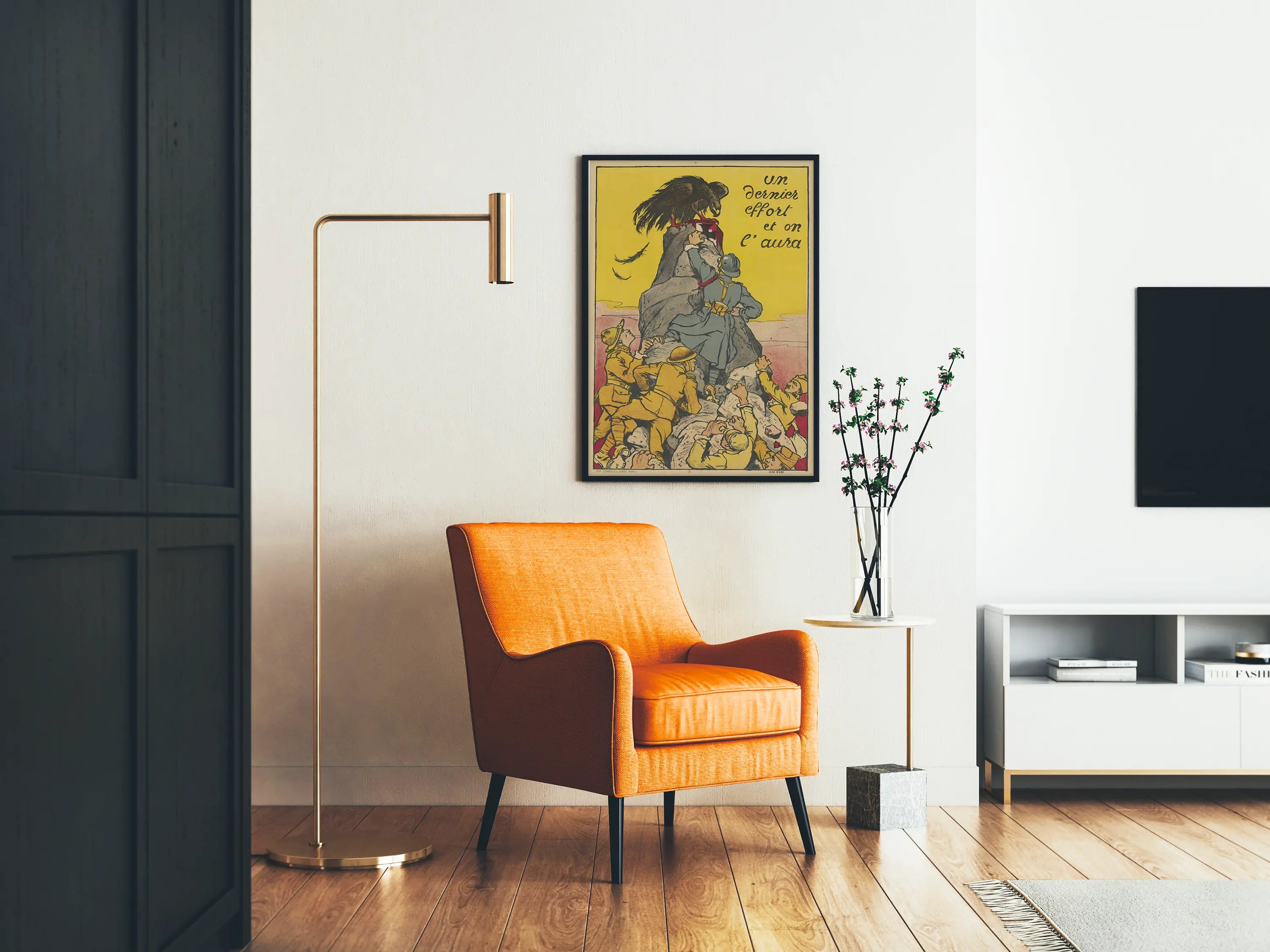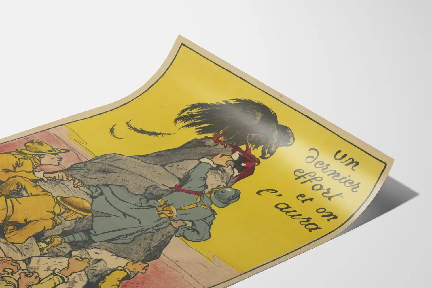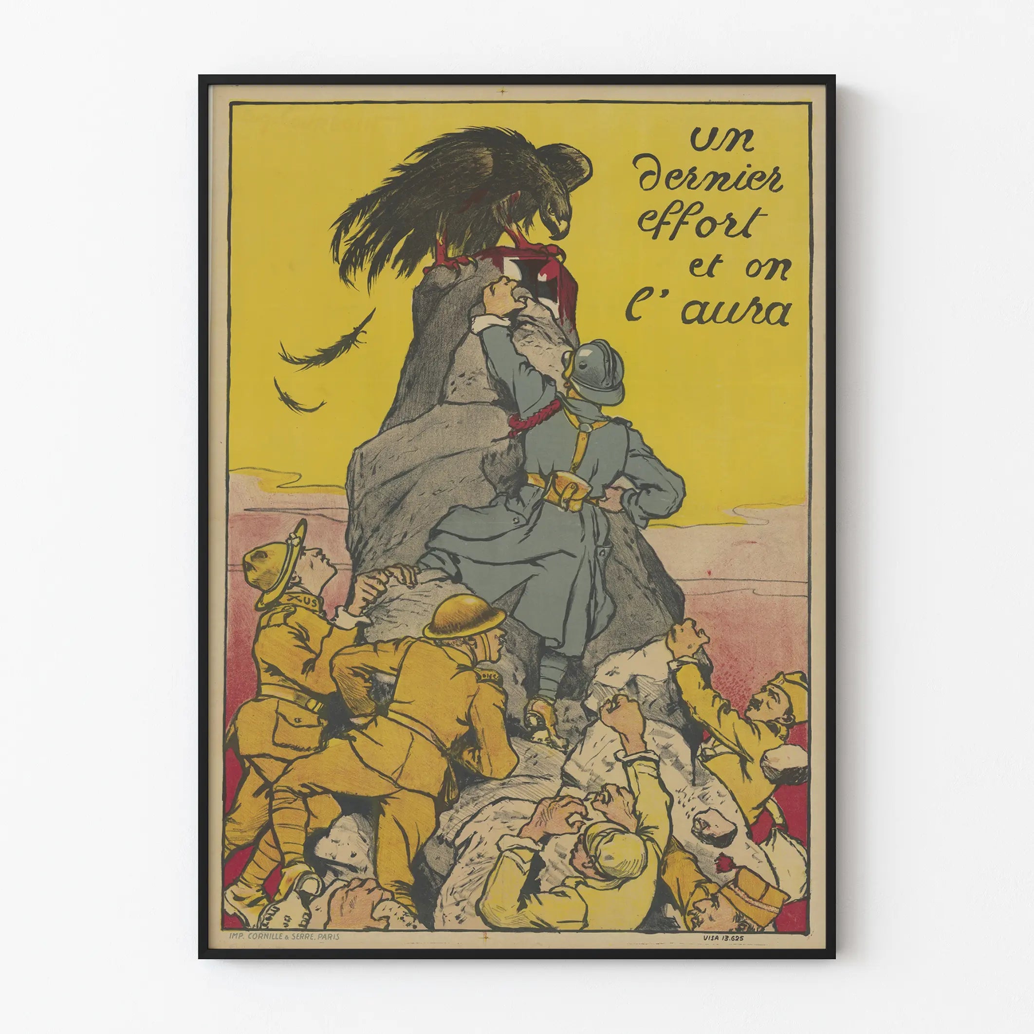 Questa locandina vintage intitolata « Un ultimo sforzo e ce la faremo » è un elemento decorativo da parete dallo stile storico e impegnato. Rappresenta una scena drammatica di soldati in uniformi d'epoca che scalano una roccia ripida, simbolo di una lotta accanita. Un soldato riesce a afferrare una bandiera con una croce bianca, mentre un grande corvo nero, emblema di minaccia o morte, è posato sulla sommità della roccia, con artigli insanguinati. Lo sfondo giallo vivace contrasta con le uniformi kaki e le rocce dai toni grigi e rossi, attirando l’attenzione sul messaggio e sull’azione rappresentata.