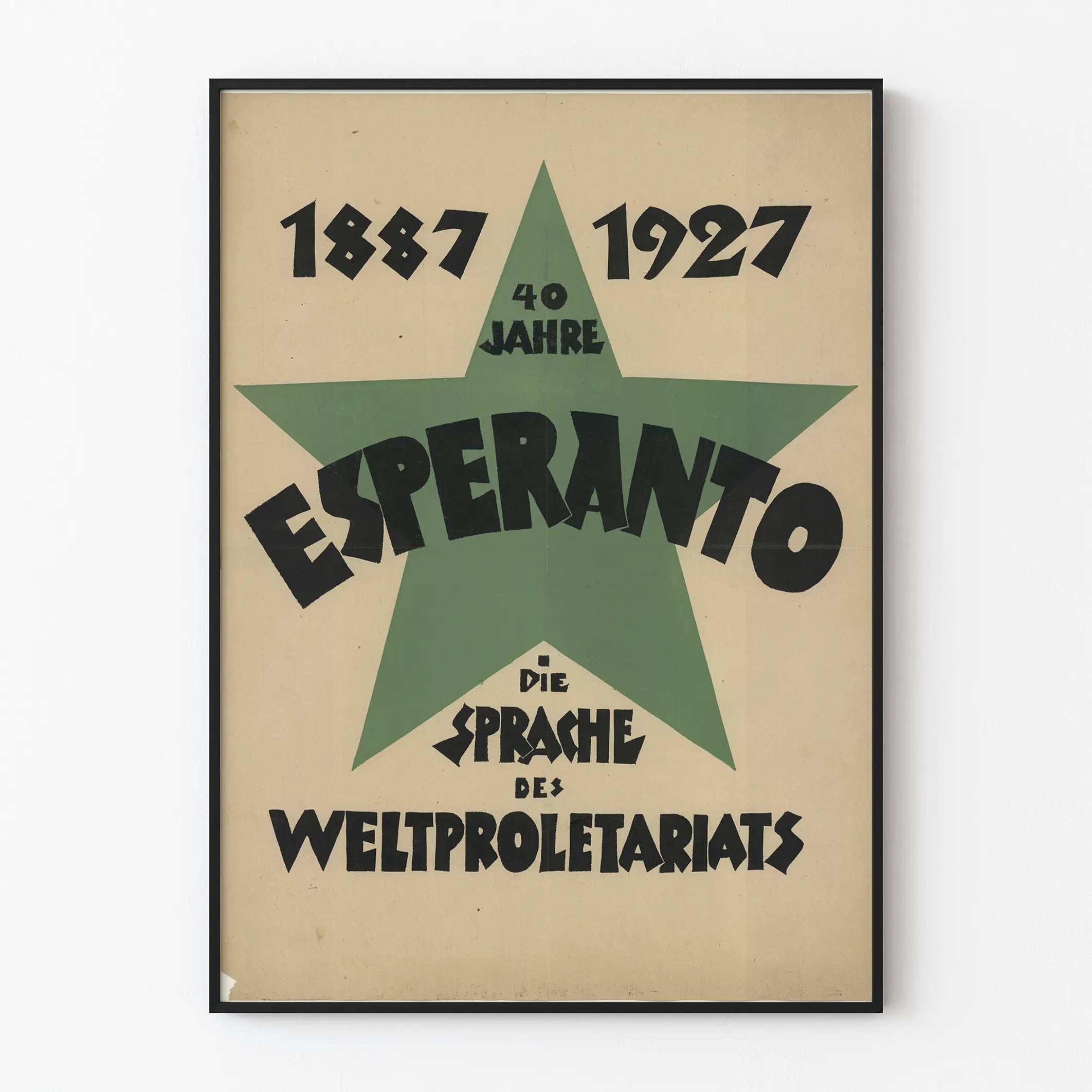 Questa locandina vintage celebra i 40 anni dell'esperanto, una lingua universale creata nel 1887. Su uno sfondo beige, una grande stella verde occupa la maggior parte della composizione. Al centro, la parola "ESPERANTO" è scritta in lettere nere robuste, disegnata in uno stile grafico marcato e angolare, conferendo alla locandina un aspetto sia moderno che impegnato. In cima alla stella, il testo "40 ANNI" sottolinea il quarantesimo anniversario. Nella parte superiore della locandina, le date "1887" e "1927" incorniciano la stella, indicando precisamente il periodo commemorato. Sotto la parola principale, si trova l'iscrizione tedesca "DIE SPRACHE DES WELTPROLETARIATS" (la lingua del proletariato mondiale), che rafforza il messaggio sociale e politico legato all'esperanto, spesso visto come uno strumento di unificazione internazionale. Questa locandina minimalista utilizza una palette cromatica limitata al verde, nero e beige, che ne accentua l'aspetto retrò e autentico. Ideale come decorazione murale per gli appassionati di lingue, storia linguistica o locandine storiche, questa stampa è un elemento decorativo potente che attirerà lo sguardo in una biblioteca, un ufficio o una sala studio. Il suo stile grafico, semplice ma incisivo, permette a questa locandina vintage di rimanere senza tempo, ricordando l'importanza culturale e politica dell'esperanto all'inizio del XX secolo. È rivolta a chi apprezza oggetti decorativi murali portatori di un messaggio forte, che unisce storia, lingua e impegno sociale.
