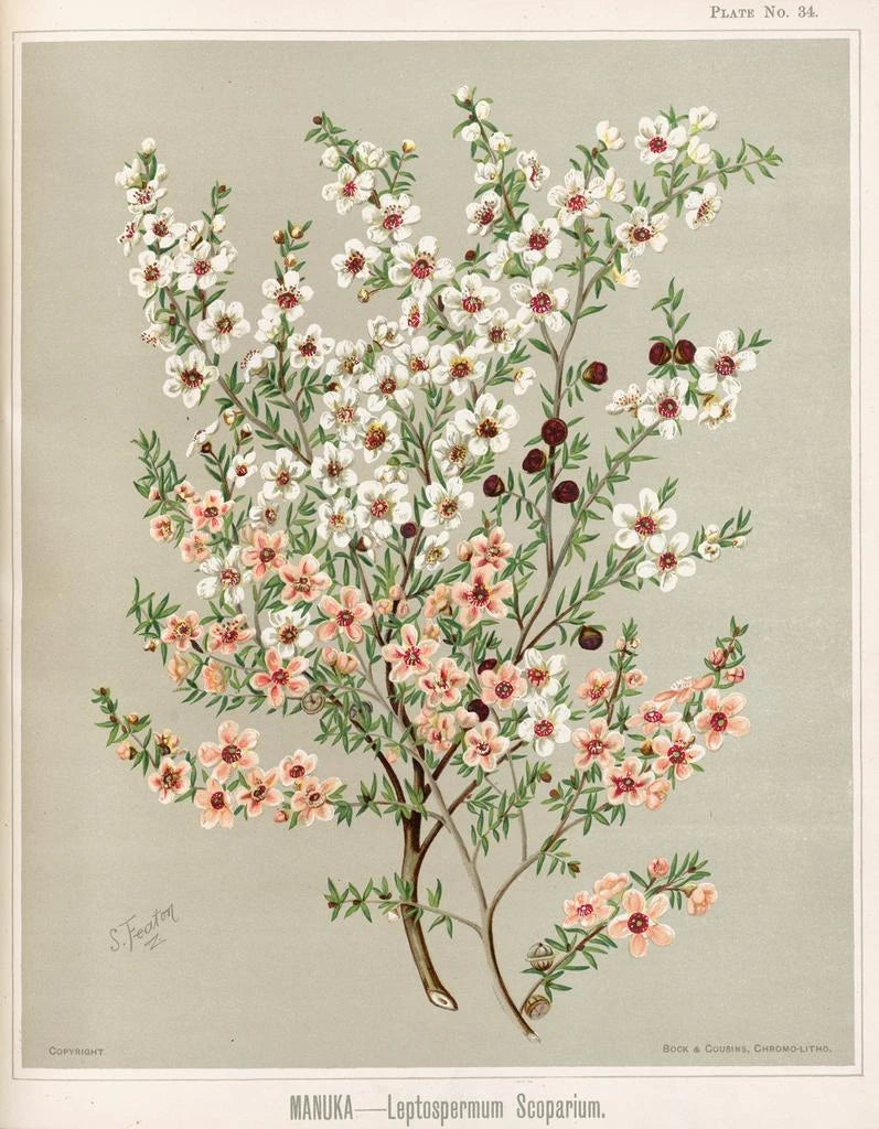Nel 'Manuka Leptospermum scoparium', Sarah Featon illustra con maestria questa pianta, ampiamente riconosciuta per le sue proprietà medicinali e la sua importanza nella cultura māori. Featon, in qualità di artista botanico del XIX secolo, ha saputo unire precisione scientifica e sensibilità artistica, creando opere che vanno oltre la semplice illustrazione. La bellezza del manuka, con i suoi fiori delicati e le sue foglie aromatiche, è catturata con una meticolosità che attira l'occhio e stimola l'immaginazione. Questo quadro non è solo una celebrazione della biodiversità neozelandese, ma anche un invito a esplorare i legami tra natura e cultura. In un contesto contemporaneo, questa opera può portare un tocco di autenticità e di calma. La stampa d'arte di questa illustrazione è da scoprire su Artem Legrand.