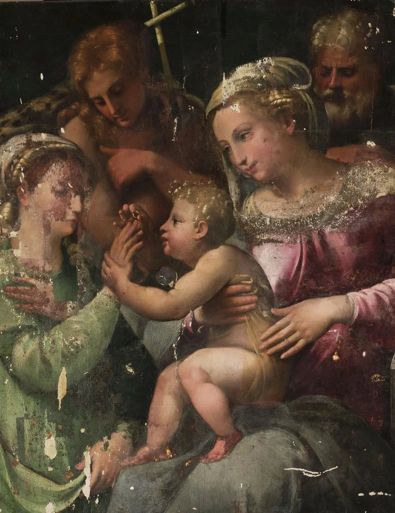 Questo affascinante dipinto raffigura il matrimonio mistico di Santa Caterina, un capolavoro di Innocenzo da Imola. La scena sacra è riccamente dettagliata, con colori vivaci e una composizione equilibrata che cattura l'attenzione e ispira devozione. Perfetto per gli amanti dell'arte religiosa e i collezionisti di opere rinascimentali, questo pezzo rappresenta un esempio eccezionale della maestria artistica di Innocenzo da Imola.