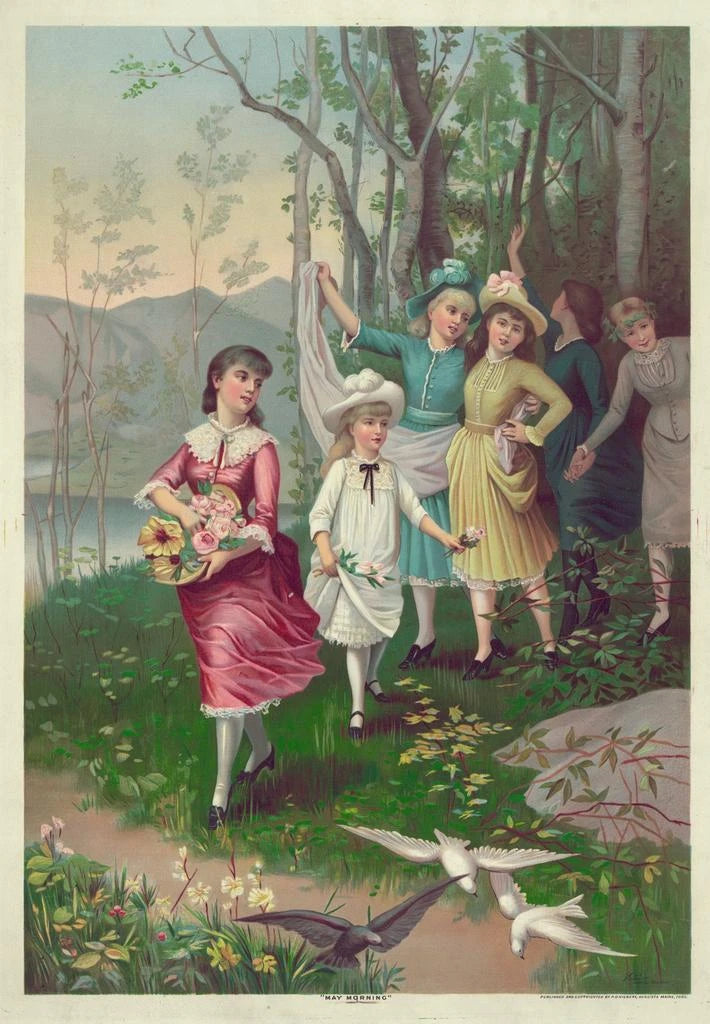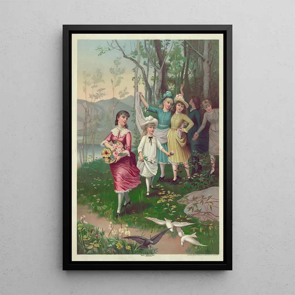 Il quadro Matin de mai evoca un'atmosfera di serenità e rinnovamento. I colori pastello, mescolando sfumature di verde tenue e di blu cielo, creano un'armonia visiva che invita alla contemplazione. La tecnica litografica utilizzata da Hatch Lith Co conferisce una texture delicata all'opera, accentuando la leggerezza degli elementi naturali rappresentati. I raggi del sole filtrano attraverso le foglie, portando una luminosità dolce che avvolge lo spettatore in un'atmosfera pacifica. Ogni dettaglio, dai fiori sbocciati agli uccelli canori, contribuisce a questa sensazione di gioia e rinnovamento, tipica della primavera.