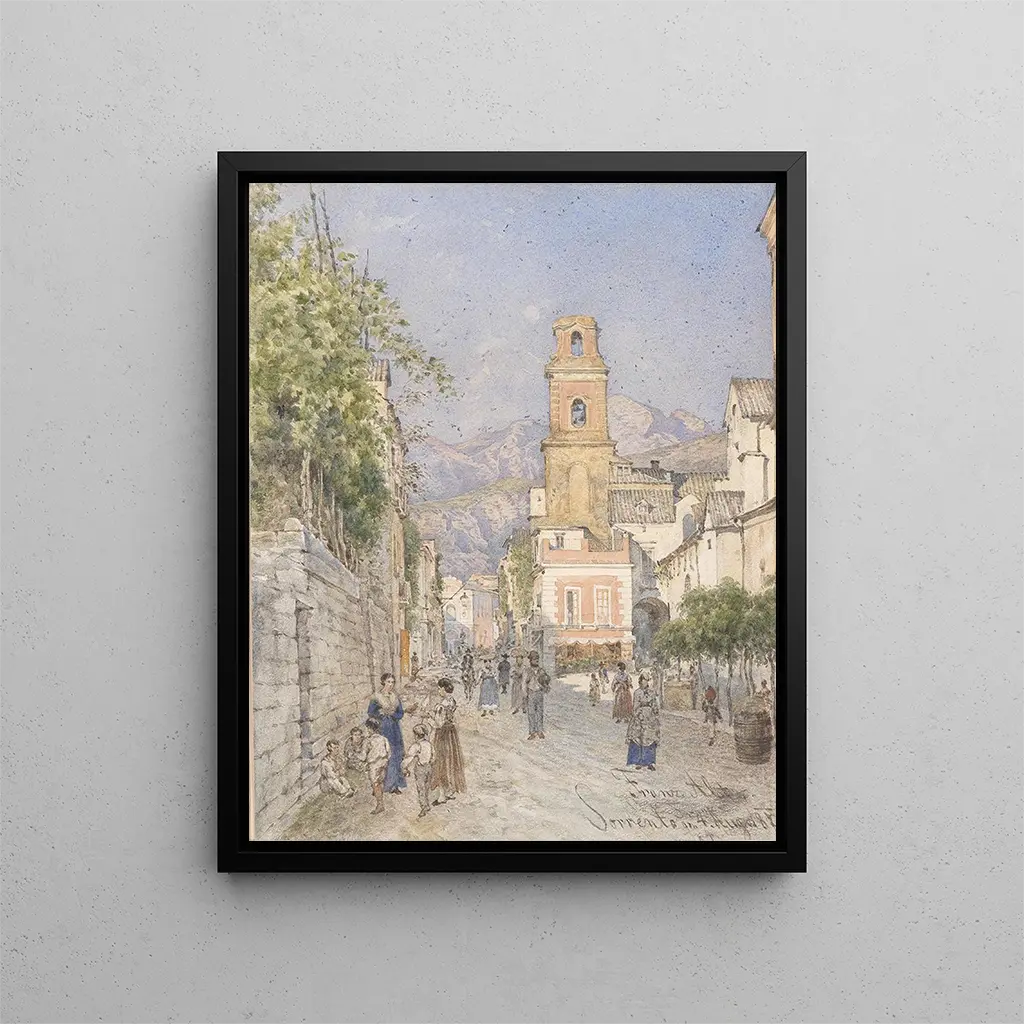 Motivo di Sorrento - Franz Alt – Introduzione affascinante La bellezza senza tempo della natura è spesso catturata da artisti che riescono a trascendere il semplice paesaggio per trasformarlo in una vera e propria opera d'arte. "Motivo di Sorrento - Franz Alt" si inserisce in questa tradizione, rivelando una visione poetica e vivace di un angolo del mondo dove il mare e la terra si incontrano in un'armonia perfetta. Quest'opera invita lo spettatore a immergersi in un quadro in cui le sfumature di blu e di verde si mescolano, evocando la dolcezza della luce mediterranea e la serenità dei paesaggi italiani. Attraverso questa stampa d'arte, l’artista riesce a trasportare l’osservatore nel cuore di Sorrento, un luogo dove il tempo sembra essersi fermato, offrendo un’evocazione visiva ed emotiva. Stile e unicità dell’opera Lo stile di Franz Alt è caratterizzato da una delicatezza e da una cura minuziosa dei dettagli che contraddistinguono il suo approccio artistico. In "Motivo di Sorrento", egli gioca abilmente con la luce e l'ombra, creando contrasti sottili che danno vita a ogni elemento del quadro. Le onde che si infrangono dolcemente contro le scogliere, il fogliame rigoglioso e gli edifici pittoreschi si fondono in una composizione equilibrata, dove ogni colore è scelto con cura per evocare un’atmosfera di pace e contemplazione. Quest'opera non si limita a rappresentare un paesaggio; racconta una storia, quella di un istante congelato in cui la natura e l’architettura coesistono in perfetta armonia. La tecnica dell’artista, che combina realismo e impressionismo, permette all’osservatore di sentire una connessione intima con il luogo, come se si potesse quasi sentire il sussurro delle onde. L’artista e la sua influenza Franz Alt, pittore del XIX secolo, è spesso riconosciuto per la sua capacità di catturare la bellezza dei paesaggi marini e costieri. La sua opera è intrisa di una sensibilità che riflette la sua ammirazione per la natura e il desiderio di condividerla con il mondo. Alt ha saputo ispirarsi ai grandi maestri della sua epoca sviluppando uno stile che gli è proprio. I suoi viaggi attraverso l’Italia, e in particolare nella regione di Sorrento, hanno alimentato la sua immaginazione e influenzato numerosi artisti contemporanei e successivi.