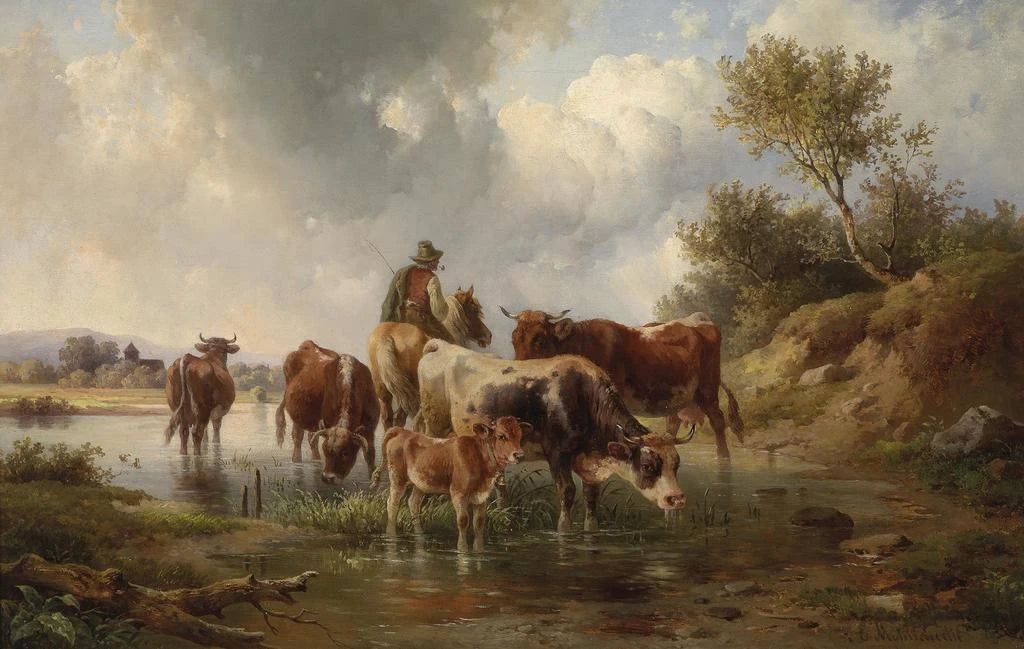 Vacca con pastori al guado: una scena bucolica ricca di vita La "Vacca con pastori al guado" di Edmund Mahlknecht rappresenta una scena pastorale vibrante, dove la natura e l'uomo coesistono in armonia. I colori terrosi e le sfumature di verde illustrano un paesaggio rurale vivace, mentre la luce morbida del sole accarezza i personaggi e gli animali. La tecnica di Mahlknecht, caratterizzata da pennellate espressive, dà vita a questa tela, creando un'atmosfera di tranquillità e semplicità. Ogni elemento, dalla vacca pacifica ai pastori attenti, contribuisce a una narrazione visiva che celebra la bellezza della vita campestre. Edmund Mahlknecht: un testimone della vita rurale Edmund Mahlknecht, attivo nel XIX secolo, è un artista le cui opere riflettono le tradizioni e i paesaggi della campagna europea. Influenzato dal movimento romantico, è riuscito a catturare momenti della vita quotidiana con una sensibilità unica. Il suo periodo è segnato da un ritorno alla natura e da una valorizzazione delle scene rurali, testimonianza di un'epoca in cui l'industrializzazione iniziava a trasformare il paesaggio. Mahlknecht, attraverso la sua arte, ci ricorda l'importanza della natura e delle attività umane, rendendolo un artista essenziale per comprendere questa transizione. Un acquisto decorativo con molteplici vantaggi La riproduzione della "Vacca con pastori al guado" è un pezzo decorativo che aggiunge un tocco rustico e caloroso al vostro interno. Perfetta per un soggiorno, una cucina o un ufficio, questa stampa d'arte evoca la serenità della vita in campagna. La qualità della riproduzione garantisce fedeltà ai dettagli e ai colori dell'opera originale, offrendo al contempo un fascino estetico che saprà conquistare i vostri ospiti. Integrando questa opera nella vostra decorazione, create uno spazio accogliente, intriso di charme e convivialità.