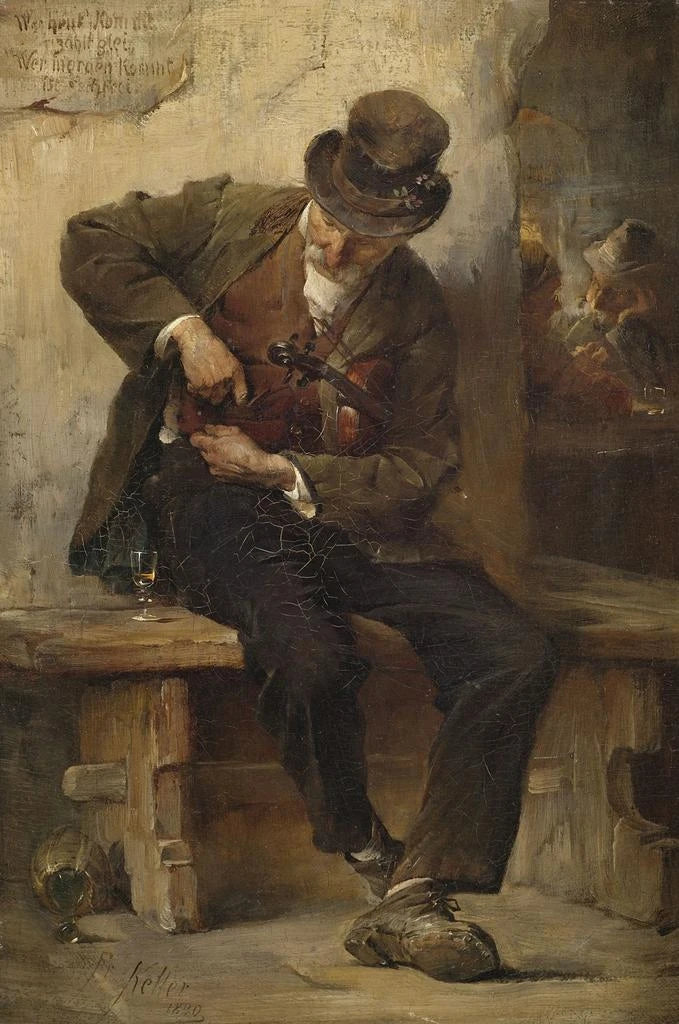 In "Musicista di strada davanti a una locanda", Friedrich von Keller cattura l'essenza di una scena animata, dove musica e convivialità si incontrano. La tela raffigura un musicista, vestito in modo tradizionale, che suona il suo strumento davanti a una locanda accogliente. I colori caldi e terrosi, associati a tocchi di luce dorata, creano un'atmosfera calda e festosa. I dettagli minuziosi dei volti dei passanti e degli elementi architettonici della locanda aggiungono profondità a quest'opera, invitando lo spettatore a immergersi in questa scena di vita quotidiana.