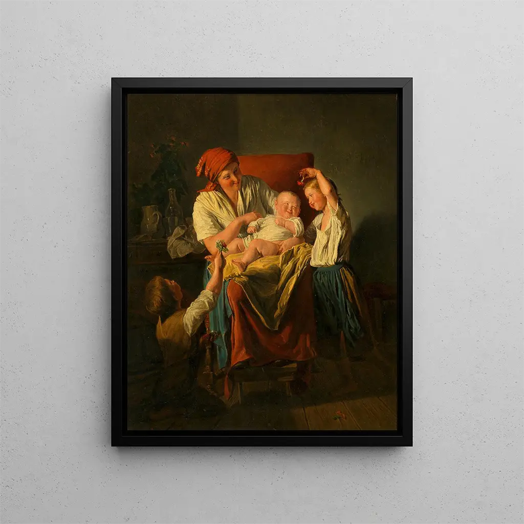 Mutterglück - Ferdinand Georg Waldmüller – Introduzione affascinante Nel vasto panorama della storia dell'arte, alcune opere si distinguono per la loro capacità di catturare emozioni profonde e universali. "Mutterglück" di Ferdinand Georg Waldmüller ne è un esempio lampante. Dipinta nel XIX secolo, questa opera evoca tenerezza e bellezza dei legami familiari, rappresentando una madre e il suo bambino in un momento di intimità dolce. Waldmüller, con il suo sguardo penetrante e sensibilità, riesce a trascendere il semplice ritratto per offrire una riflessione sulla maternità e sulla gioia che essa genera. La riproduzione di questa opera permette di immergersi nell'universo emotivo dell'artista, celebrando al contempo la bellezza delle relazioni umane. Stile e unicità dell’opera Lo stile di Waldmüller si caratterizza per un approccio realistico, intriso di grande delicatezza. In "Mutterglück", i dettagli minuziosi dei volti, la dolcezza delle espressioni e la luce calda che avvolge la scena testimoniano la sua abilità nell'osservare il mondo che lo circonda. I colori, vivaci e armoniosi, creano un'atmosfera di serenità e felicità. L'artista riesce a stabilire un dialogo tra i personaggi e lo spettatore, invitando quest'ultimo a percepire la tenerezza che emana da questa scena. Waldmüller non si limita a rappresentare una madre e il suo bambino; immortala un momento prezioso, un istante di grazia che risuona con chiunque abbia conosciuto l'amore materno. L’artista e la sua influenza Ferdinand Georg Waldmüller, nato nel 1793 in Austria, è una figura emblematica del movimento romantico. La sua carriera, segnata da una ricerca incessante di bellezza ed emozione, ha influenzato numerosi artisti contemporanei e successivi. Waldmüller è spesso lodato per la sua capacità di unire realismo e idealizzazione, creando così opere che toccano il cuore rimanendo ancorate alla realtà. Il suo approccio alla pittura di genere, in cui dipinge scene della vita quotidiana con profondità emotiva, ha aperto la strada a un nuovo modo di vedere e rappresentare l'umanità. Ricollocando l'individuo al centro della sua arte, è riuscito a catturare