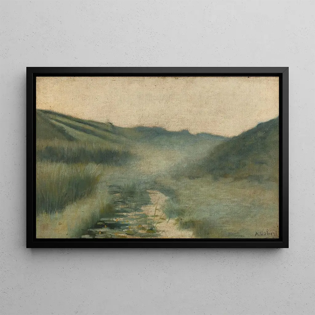 Dans "Brouillard du matin à Dilette Flamanville", Alphonse Osbert nous plonge dans une atmosphère brumeuse et poétique. Les nuances de gris et de bleu se mêlent harmonieusement, créant une sensation d'évanescence. La technique du peintre, qui utilise des touches délicates et des dégradés subtils, accentue la douceur de la scène. Ce tableau évoque une tranquillité presque irréelle, où la nature semble suspendue dans le temps. Les silhouettes des arbres se dessinent à peine, comme si elles émergeaient d'un rêve. L'œuvre invite à la contemplation, à une immersion dans un paysage où le réel et l'imaginaire se confondent.