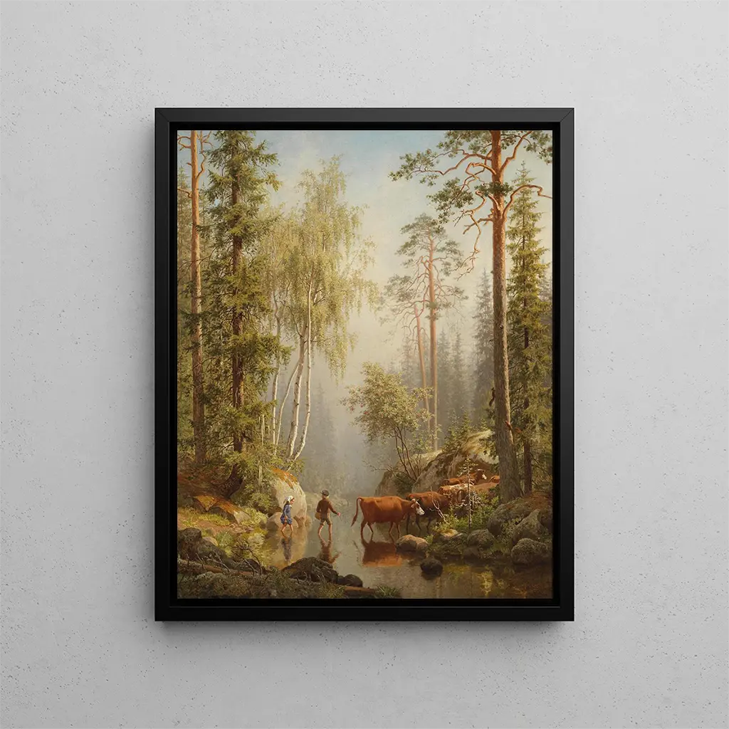 Carl Bøgh, pittore danese del XIX secolo, è spesso associato al movimento romantico, che promuove l'espressione delle emozioni e la celebrazione della natura. La sua fascinazione per i paesaggi scandinavi e il desiderio di catturare la bellezza degli ambienti naturali hanno segnato il suo percorso artistico. Bøgh ha saputo ispirarsi ai maestri del suo tempo sviluppando al contempo una voce unica, facendone un pioniere nella rappresentazione dei paesaggi nordici. Le sue opere, come "Nel ruscello Woodland", testimoniano di una