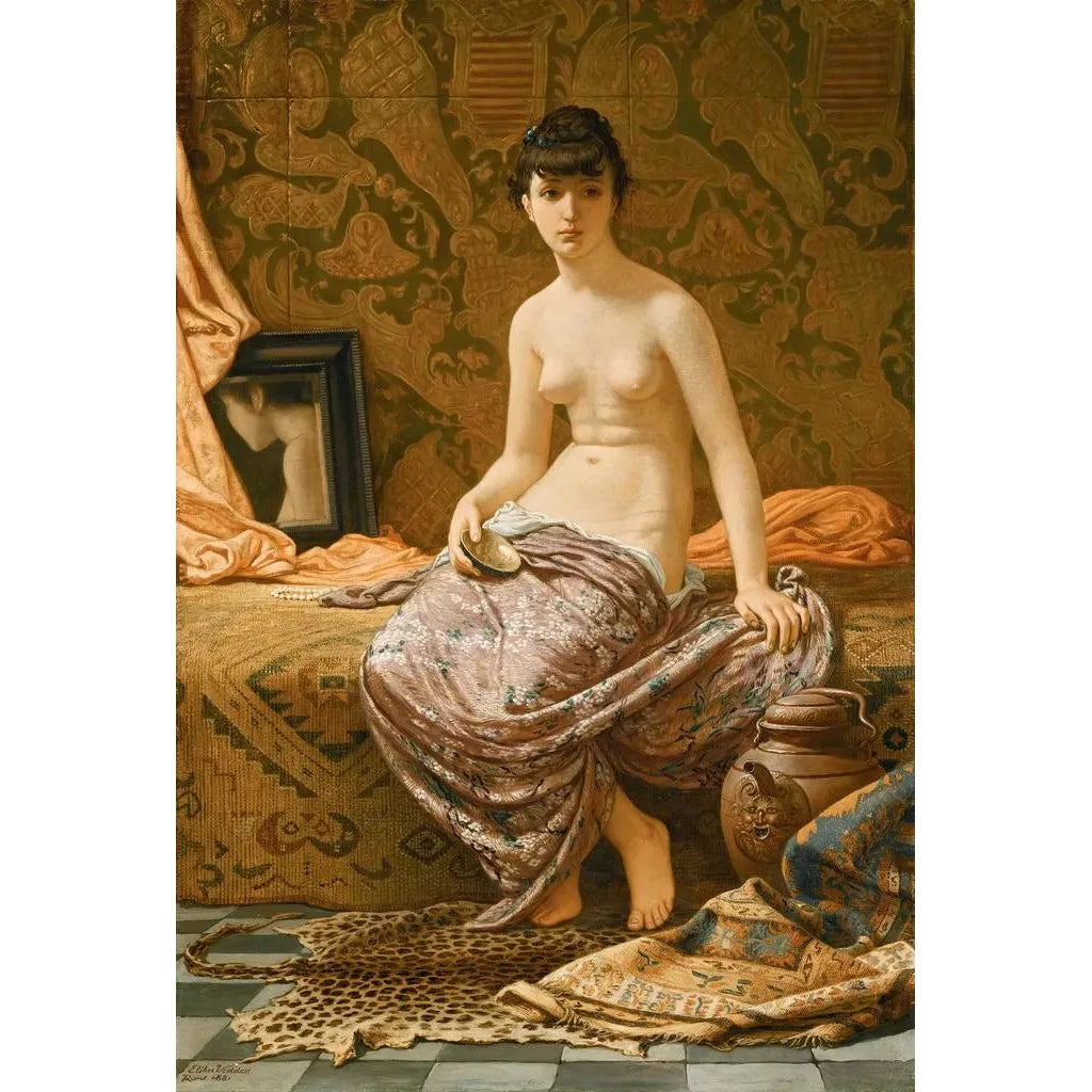 L’Odalisque di Elihu Vedder è un’opera che evoca un mondo di sensualità e mistero. Con le sue tonalità calde e i motivi orientali, questa tela trasporta lo spettatore in un universo di sogno e voluttà. La composizione delicata mette in risalto la silhouette aggraziata della figura femminile, circondata da un decoro ricco di dettagli che catturano lo sguardo. La tecnica di Vedder, allo stesso tempo precisa ed espressiva, crea un’atmosfera di calma e contemplazione. Ogni elemento dell’opera sembra raccontare una storia, quella di un istante sospeso tra realtà e immaginazione.