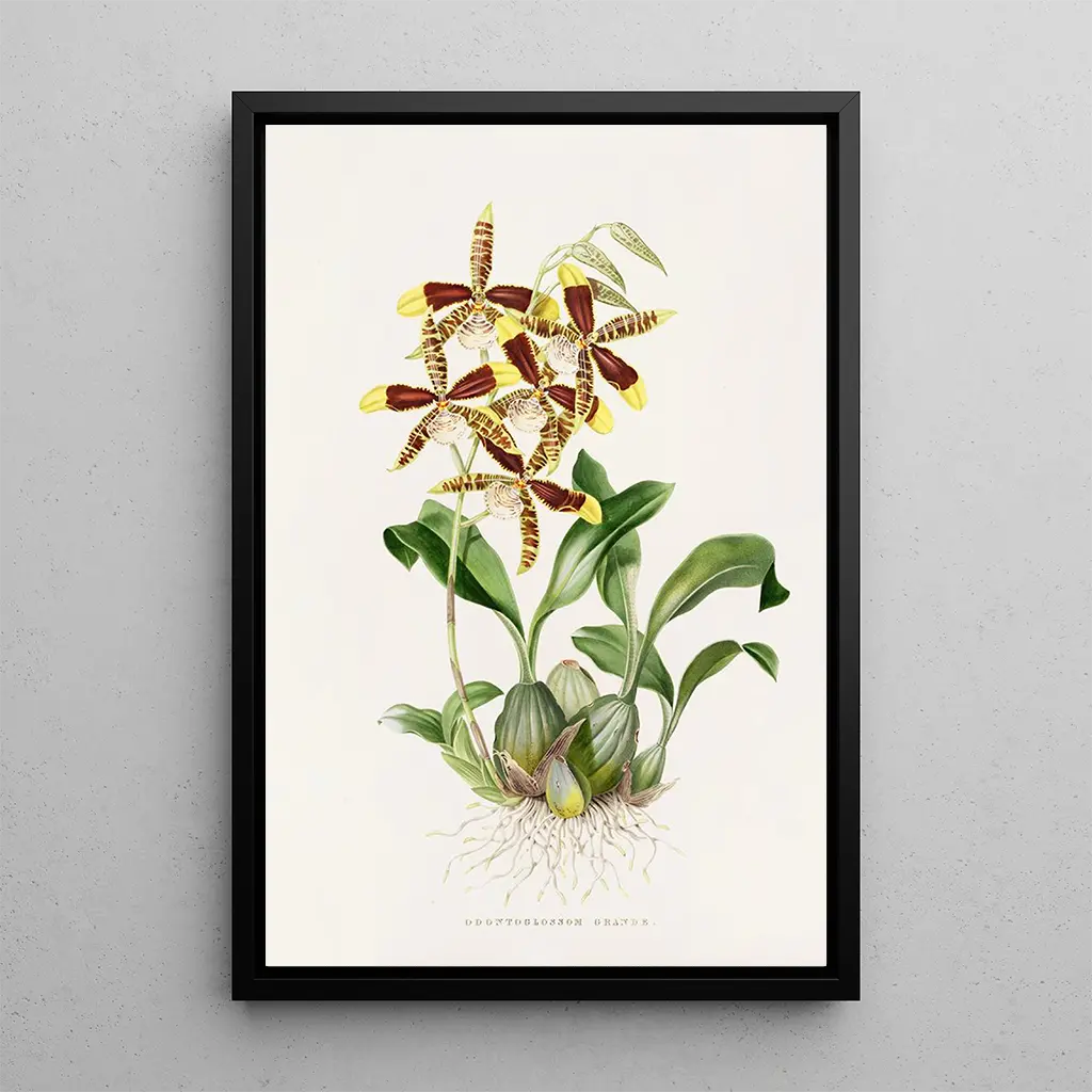 Odontoglossum Grande : un'esplosione di colori floreali L’Odontoglossum Grande, opera emblematico di James Bateman, ci trasporta in un universo rigoglioso dove la natura si esprime con brillantezza. Questa stampa d'arte mette in evidenza tonalità vibranti di giallo, rosso e viola, creando un contrasto sorprendente che cattura immediatamente lo sguardo. La tecnica dell'acquarello, usata con finezza, dà vita a ogni petalo, ogni foglia, infondendo un’atmosfera di leggerezza e delicatezza. L’artista riesce a catturare la bellezza effimera di questa orchidea, invitando lo spettatore a una contemplazione serena e a un apprezzamento della natura. James Bateman : un pioniere dell’arte orticola James Bateman, botanico e artista del XIX secolo, è riconosciuto per i suoi contributi all’arte orticola e alla rappresentazione delle piante. La sua opera si inserisce in un periodo in cui l’interesse per la botanica e le scienze naturali conosce un grande sviluppo. Influenzato dalle esplorazioni botaniche del suo tempo, Bateman ha saputo unire scienza e arte, rendendo omaggio alla bellezza delle specie vegetali. Il suo lavoro sulle orchidee, in particolare, testimonia il suo impegno nel documentare e celebrare la diversità floreale, facendone una figura imprescindibile nel campo dell’arte botanica. Una riproduzione decorativa con molteplici vantaggi La riproduzione dell’Odontoglossum Grande è un pezzo decorativo ideale per abbellire il tuo spazio di vita, che sia in un soggiorno, in uno studio o in una camera da letto. La qualità di stampa e la fedeltà all’originale ne fanno una scelta attraente per gli appassionati d’arte e di natura. Questo quadro porta un tocco di freschezza e colore, evocando la bellezza dei giardini esotici. Integrando questa tela nella tua decorazione, offri al tuo interno un’atmosfera calda e accogliente, celebrando allo stesso tempo l’arte e la botanica.
