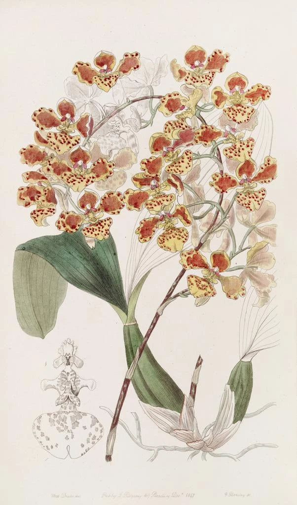 Sydenham Edwards, attivo all'inizio del XIX secolo, è riconosciuto come uno dei grandi nomi dell'illustrazione botanica. Influenzato dal movimento romantico, ha saputo catturare la bellezza delle piante con una sensibilità unica. Le sue opere, spesso pubblicate in volumi di botanica, testimoniano il suo impegno nel rendere omaggio alla diversità floreale. L'oncid frangé si inserisce in un periodo in cui l'interesse per la botanica era in pieno sviluppo, e Edwards ha svolto un ruolo chiave nella divulgazione di queste conoscenze attraverso le sue illustrazioni. Il suo lascito perdura, ispirando ancora oggi gli appassionati di botanica e d'arte.