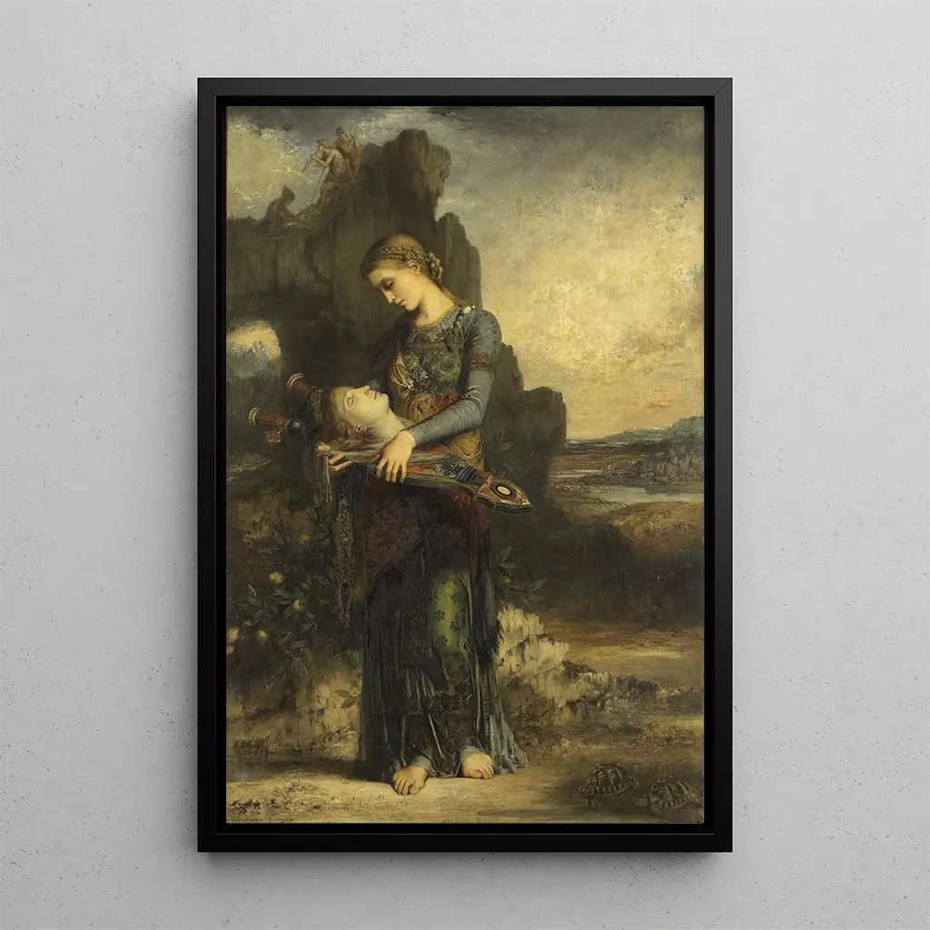 Gustave Moreau, né en 1826, est un artiste emblématique du mouvement symboliste, dont l'œuvre explore les thèmes de la mythologie et de l'imaginaire. Sa formation à l'École des Beaux-Arts de Paris et ses voyages en Italie influencent profondément son style, qui mêle romantisme et éléments décoratifs. Moreau se distingue par sa capacité à transformer des récits mythologiques en tableaux poétiques, où chaque détail a une signification. "Orphée" est une illustration parfaite de cette approche, où la figure du musicien devient un symbole de l'art et de la transcendance, tout en s'inscrivant dans un contexte artistique riche en innovations.