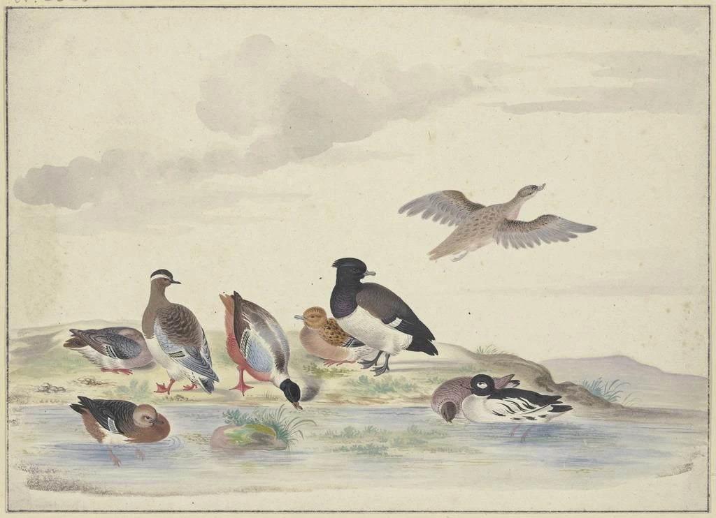 Otto anatre di diverse specie sul bordo dell'acqua - Pieter Holsteijn