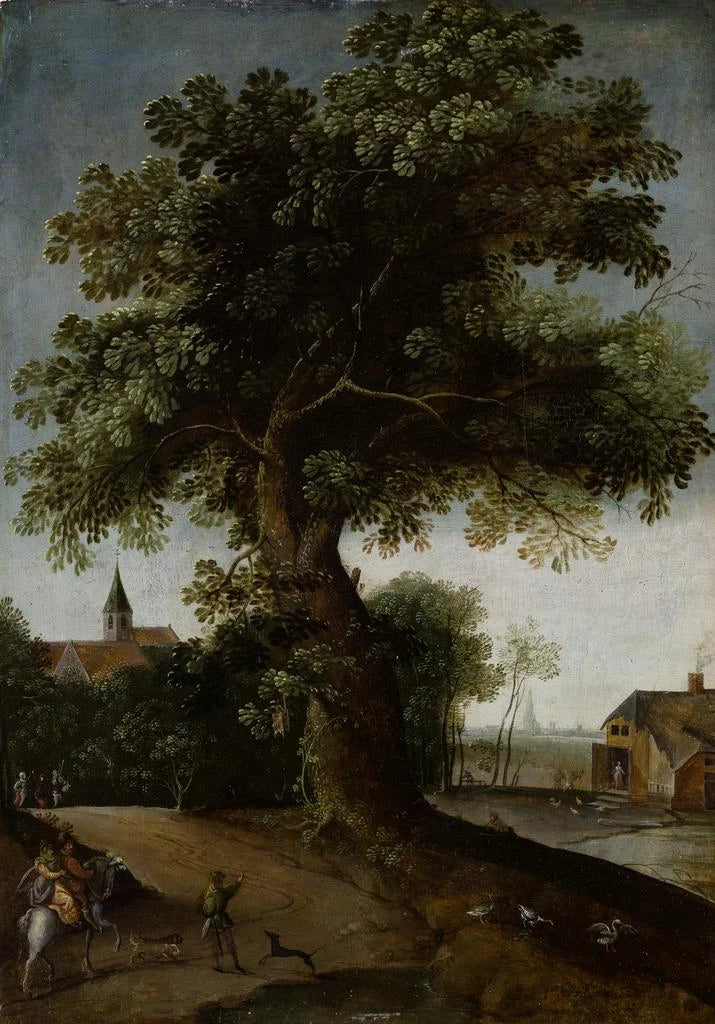 In questa opera coinvolgente, Jacob Grimmer ci trasporta nel cuore di un paesaggio bucolico dove un grande albero maestoso si erge fiero. Le sfumature di verde, marrone e blu si mescolano armoniosamente, creando un'atmosfera serena e rilassante. La tecnica della pittura ad olio permette di rendere la texture delle foglie e la profondità del cielo, mentre la luce naturale sembra giocare sulle superfici, aggiungendo una dimensione quasi vivente alla scena. Questo quadro invita alla contemplazione, alla rêverie, e ci ricorda la bellezza semplice ma potente della natura.