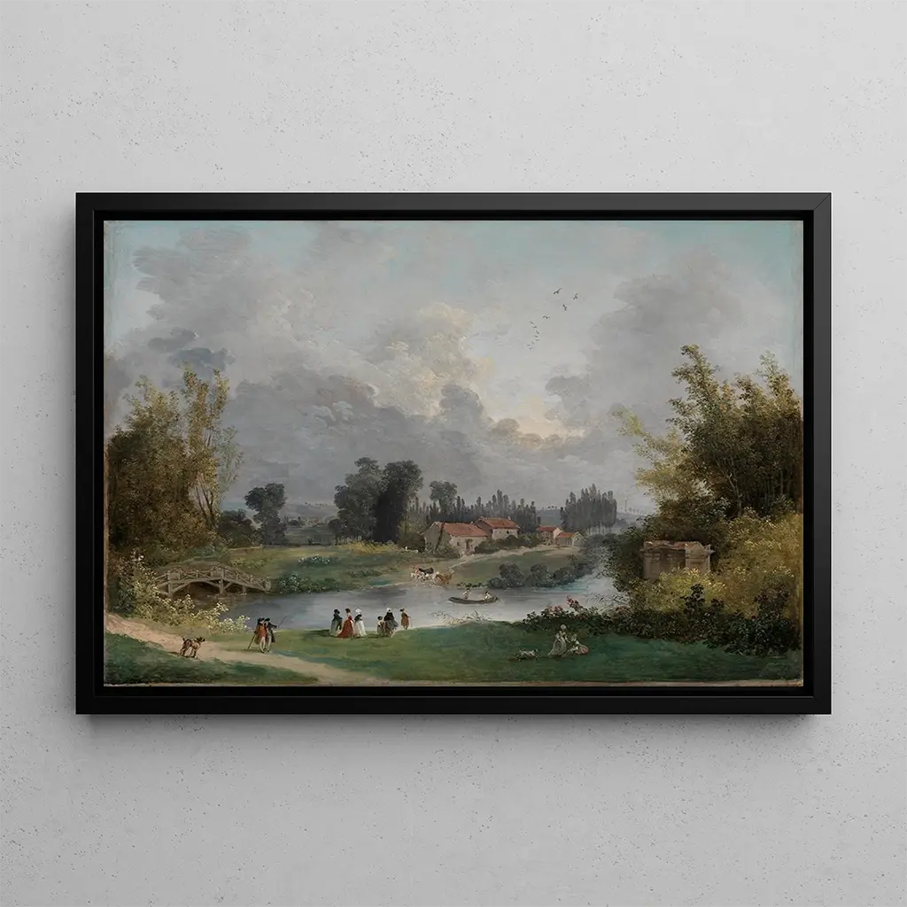 Questa stampa d'arte, intitolata "Paesaggio di parco", invita a un'immersione in un mondo di serenità e bellezza naturale. Hubert Robert, maestro del paesaggio, utilizza una tavolozza di colori morbidi e luminosi, dove i verdi vivaci degli alberi si mescolano alle sfumature delicate del cielo. La tecnica della pittura ad olio permette di rendere i dettagli con una finezza notevole, creando un'atmosfera pacifica e contemplativa. Gli elementi naturali, come i fiumi tortuosi e i sentieri ombreggiati, sembrano invitare lo spettatore a passeggiarvi, a percepire la freschezza dell'aria e la dolcezza della luce.