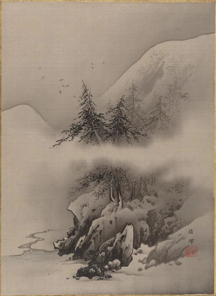 Hashimoto Gahō, figura emblematica dell'arte giapponese del XIX secolo, ha saputo unire tradizione e innovazione. Influenzato dai grandi maestri dell'ukiyo-e, ha sviluppato uno stile unico che combina precisione e poesia. Gahō ha dedicato la sua carriera alla rappresentazione di paesaggi e scene della vita quotidiana, catturando l'essenza della sua epoca pur preservando le tecniche ancestrali. La sua opera, "Paesaggio innevato", testimonia la sua abilità nel evocare emozioni attraverso composizioni delicate, rendendolo un artista imprescindibile del suo tempo.