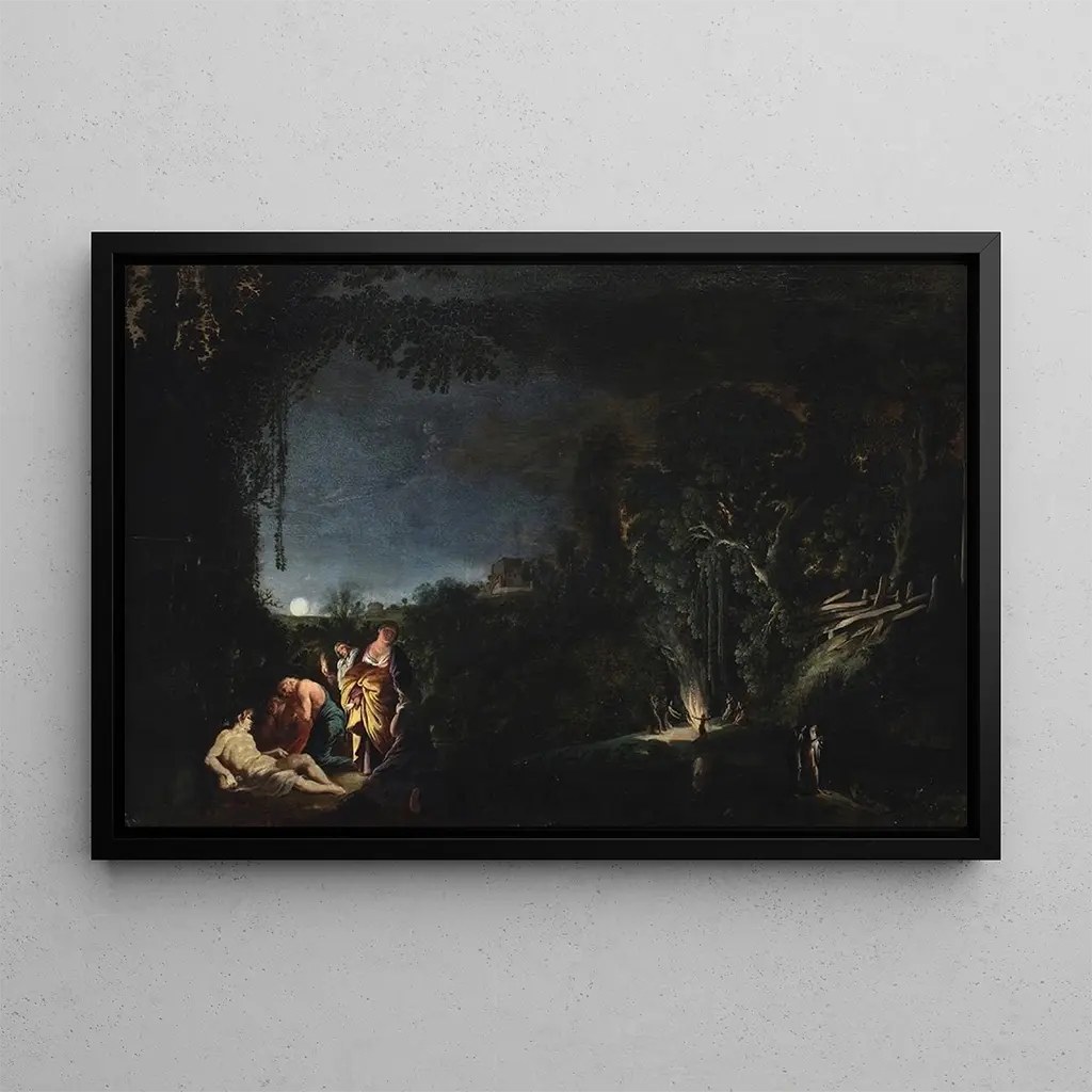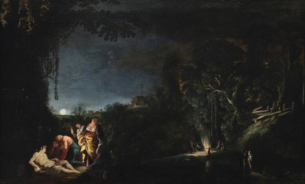 Questo affascinante quadro di Moyses van Uyttenbroeck evoca un'atmosfera mistica, dove la luna illumina un paesaggio incantato. Le tonalità argentate e blu si mescolano armoniosamente, creando un contrasto sorprendente con i motivi mitologici che popolano la tela. La tecnica dell'artista, che combina finezza e dettagli minuziosi, permette di immergersi in un universo dove sogno e realtà si confondono. Ogni elemento, dalle nuvole vaporose alle silhouette mitiche, invita a una contemplazione profonda, offrendo un'evocazione verso un mondo intriso di magia.