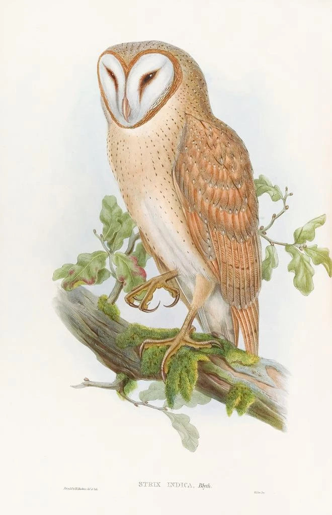 Il Petit-duc indien, avec ses plumes délicates et ses yeux perçants, se dévoile dans une composition harmonieuse qui capte l’attention. Les nuances de brun et de crème se mêlent subtilement, évoquant la douceur des paysages indiens. La technique de gravure utilisée par John Gould permet de rendre chaque détail avec une précision remarquable, créant une atmosphère à la fois sereine et fascinante. Cette œuvre invite à une contemplation attentive, révélant la majesté de cet oiseau nocturne, souvent méconnu.