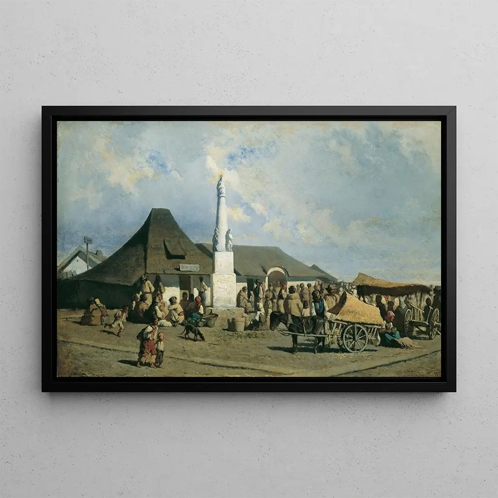 In questa stampa d'arte di Place du Marché à Szolnok, l’artista Johann Gualbert Raffalt cattura l’essenza di un momento di vita, dove i colori vivaci e i dettagli minuziosi si mescolano per creare un’atmosfera calorosa. Le sfumature di verde e blu dominano il quadro, evocando la freschezza di una giornata soleggiata, mentre i tocchi di rosso e arancione portano una dinamica vivace. La tecnica di Raffalt, che mescola impressionismo e realismo, permette di percepire quasi il movimento dei personaggi e l’animazione del mercato. Ogni elemento, dagli espositori di frutta ai passanti, contribuisce a una narrazione visiva ricca e coinvolgente.