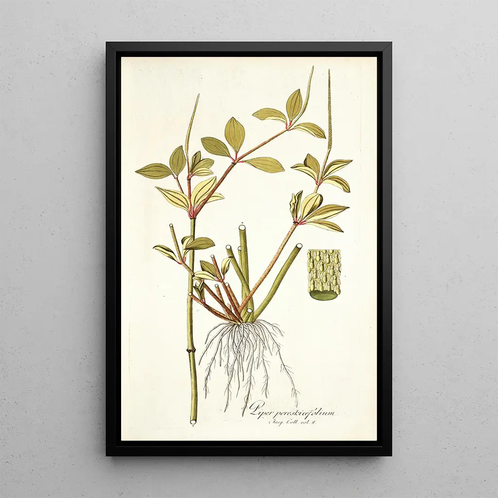 La stampa d'arte di Piper pereskiaefolium, opera di Nikolaus Joseph Freiherr von Jacquin, ci trasporta in un mondo rigoglioso dove la diversità di forme e colori si esprime in tutta la sua ricchezza. Questo quadro mette in evidenza le foglie carnose e i rami robusti della pianta, illustrando perfettamente la sua adattabilità agli ambienti tropicali. Le tonalità vibranti di verde, arricchite da tocchi di giallo e marrone, richiamano la ricchezza della flora tropicale. La tecnica dell'acquarello, padroneggiata da Jacquin, permette di catturare la luce e la texture, creando un'atmosfera vivace e dinamica. Quest'opera è un invito a esplorare le meraviglie della natura e ad apprezzarne la bellezza unica.
