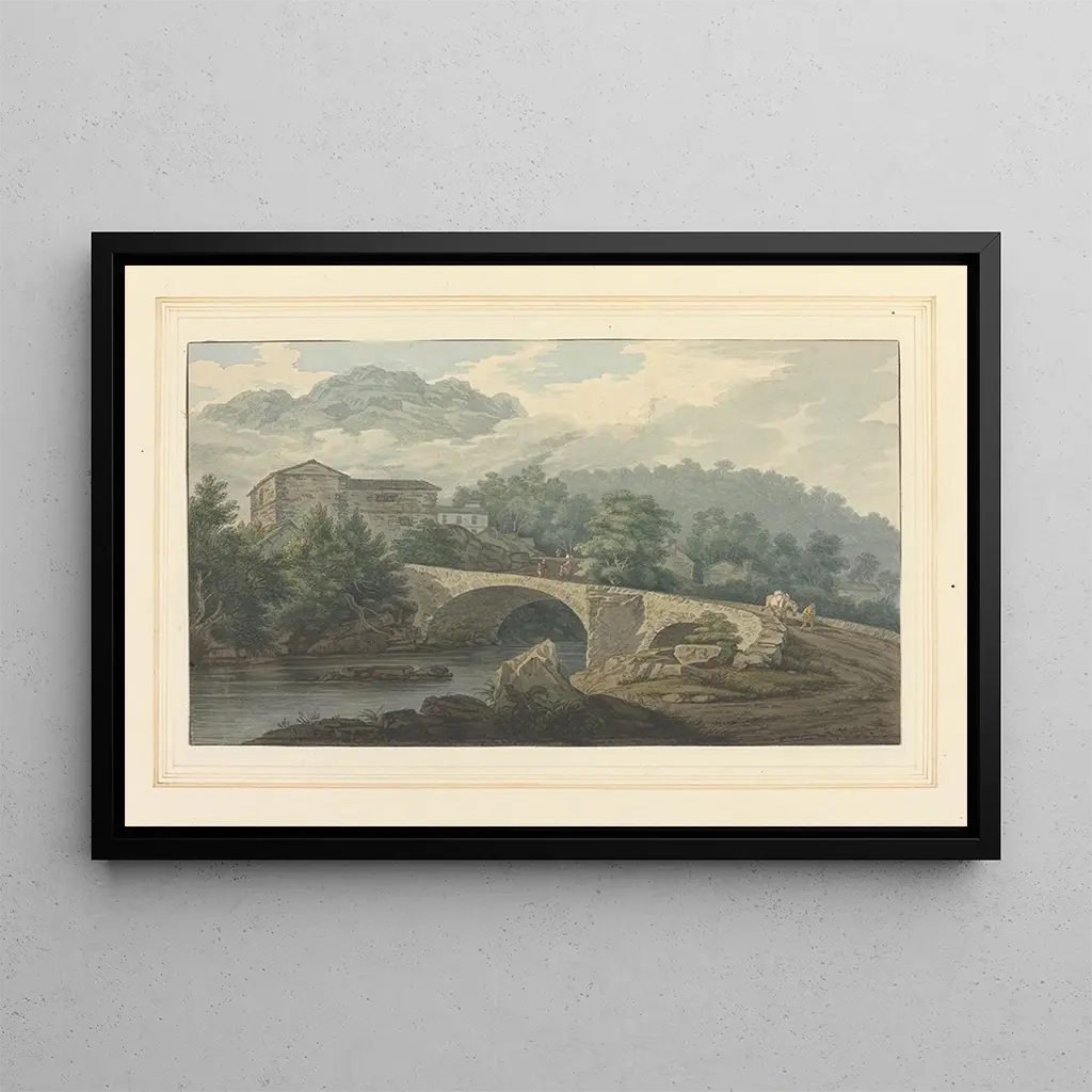 Pont de Brathay : una serenità bucolica nel cuore della natura La stampa d'arte Pont de Brathay, realizzata da Joseph Farington, ci trasporta ai margini di un fiume tranquillo, circondato da paesaggi verdi. Le tonalità morbide di verde e blu evocano un'atmosfera calma, dove il riflesso degli alberi nell'acqua crea un'armonia visiva affascinante. Farington, con la sua maestria nella gestione della luce e dell'ombra, riesce a catturare l'essenza stessa di questo luogo idilliaco. La composizione, centrata sul ponte di legno, invita a una passeggiata immaginaria, permettendo allo spettatore di evadere in questa scena bucolica. Ogni dettaglio, dalle foglie alle nuvole, contribuisce all'atmosfera serena di quest'opera. Joseph Farington : un testimone della bellezza inglese Joseph Farington, pittore e acquerellista britannico del XVIII secolo, è famoso per i suoi paesaggi evocativi. La sua opera si inserisce nel movimento romantico, dove la natura è messa in primo piano come fonte di ispirazione ed emozione. Farington è stato influenzato dai suoi viaggi attraverso l'Inghilterra, catturando scene pittoresche e momenti della vita quotidiana. Il suo approccio dettagliato e il suo senso acuto della composizione lo rendono un artista rispettato del suo tempo. La riproduzione del Pont de Brathay illustra perfettamente il suo talento nel rappresentare la bellezza naturale, testimonianza dell'importanza della natura nell'arte britannica. Una proposta decorativa con molteplici vantaggi La riproduzione del quadro Pont de Brathay è un elemento decorativo che si integra armoniosamente in diversi ambienti. Che si tratti di un soggiorno, di un ufficio o di una camera da letto, questa tela porta un tocco di calma e serenità. La qualità di stampa garantisce fedeltà ai colori e ai dettagli dell'opera originale, rendendo questa stampa d'arte una scelta estetica di primo piano. Aggiungendo quest'opera alla tua decorazione, crei uno spazio rilassante, rendendo omaggio alla bellezza dei paesaggi inglesi. L'attrattiva visiva di questa stampa d'arte la rende una scelta ideale per gli appassionati d'arte e di natura.