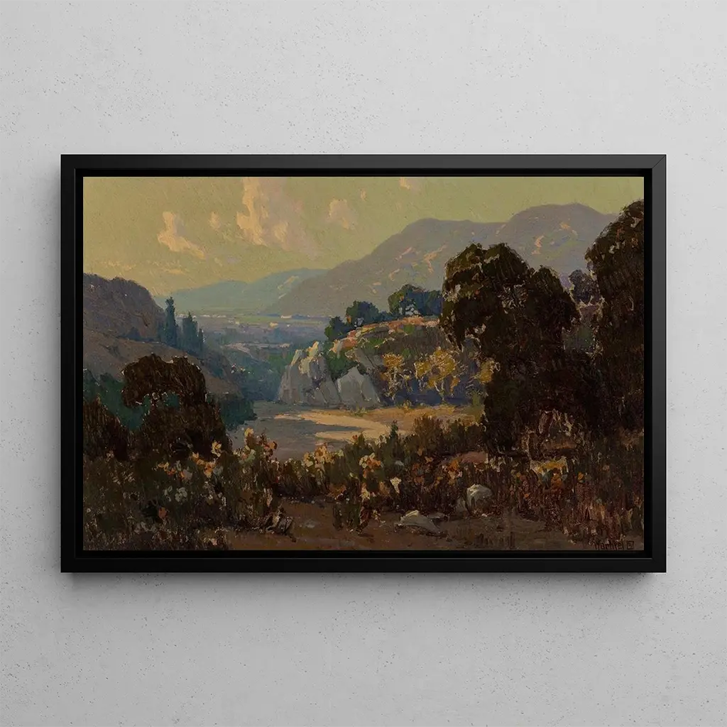 In "Porte des Diables, California", Elmer Wachtel ci trasporta nel cuore di un paesaggio californiano mozzafiato. Le tonalità calde e terrose, mescolate alle sfumature di blu del cielo, evocano la bellezza selvaggia della natura. La composizione dinamica, con le sue rocce imponenti e la vegetazione lussureggiante, crea una scena allo stesso tempo drammatica e serena. Wachtel, con la sua maestria nelle luci e nelle ombre, riesce a catturare l'essenza stessa di questo luogo emblematico, invitando lo spettatore a esplorare le meraviglie della California.