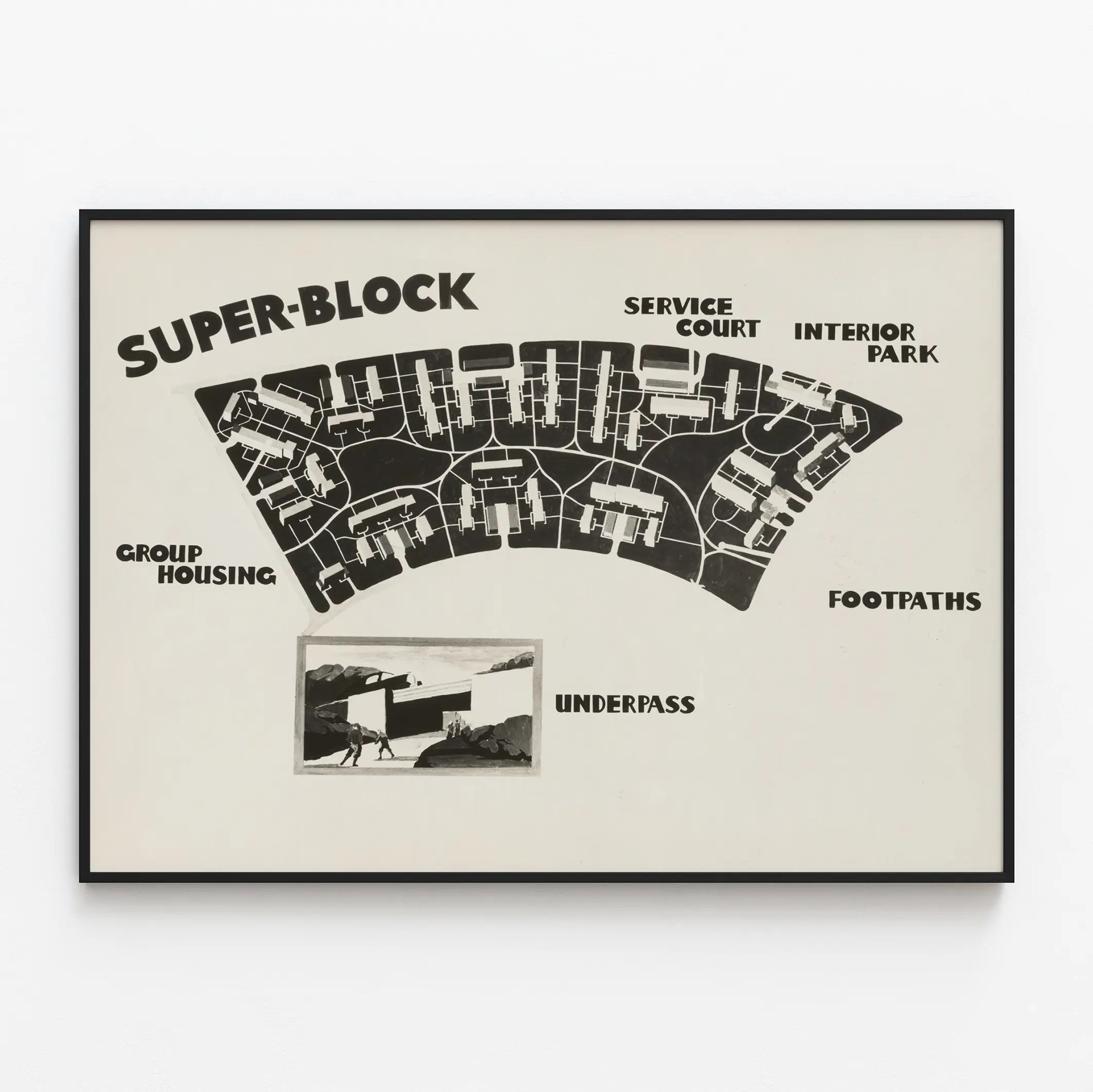 Découvrez cette affiche vintage représentant un plan urbanistique intitulé « Super-Block », idéale pour embellir votre intérieur avec une touche d’architecture et d’urbanisme. Ce poster met en avant une organisation urbaine innovante centrée sur un aménagement en super-bloc, comprenant différentes zones telles que le groupe de logements (Group Housing), une cour de service (Service Court), un parc intérieur (Interior Park), des chemins piétonniers (Footpaths) et un passage souterrain (Underpass). Chaque élément est clairement identifié par une typographie audacieuse et graphique, donnant un rendu visuel à la fois pédagogique et esthétique. Cette décoration murale moderne apportera une atmosphère originale à votre espace, en particulier pour les amateurs d'architecture, de design urbain ou d'histoire de la planification urbaine. Le style monochrome de ce poster accentue l’effet graphique du plan, faisant de cette affiche un véritable tableau à accrocher au mur. Parfaite pour un salon, un bureau ou une salle d’exposition, cette affiche décorative peut également être intégrée dans un intérieur design afin de souligner une ambiance contemporaine et sophistiquée. Offrez à vos murs une affiche au concept unique qui illustre la structure urbaine d’un super-bloc, propice à la réflexion sur l’organisation des espaces de vie collective. Un choix décoratif original pour ceux qui souhaitent allier esthétique et thématique architecturale dans leur décoration murale.