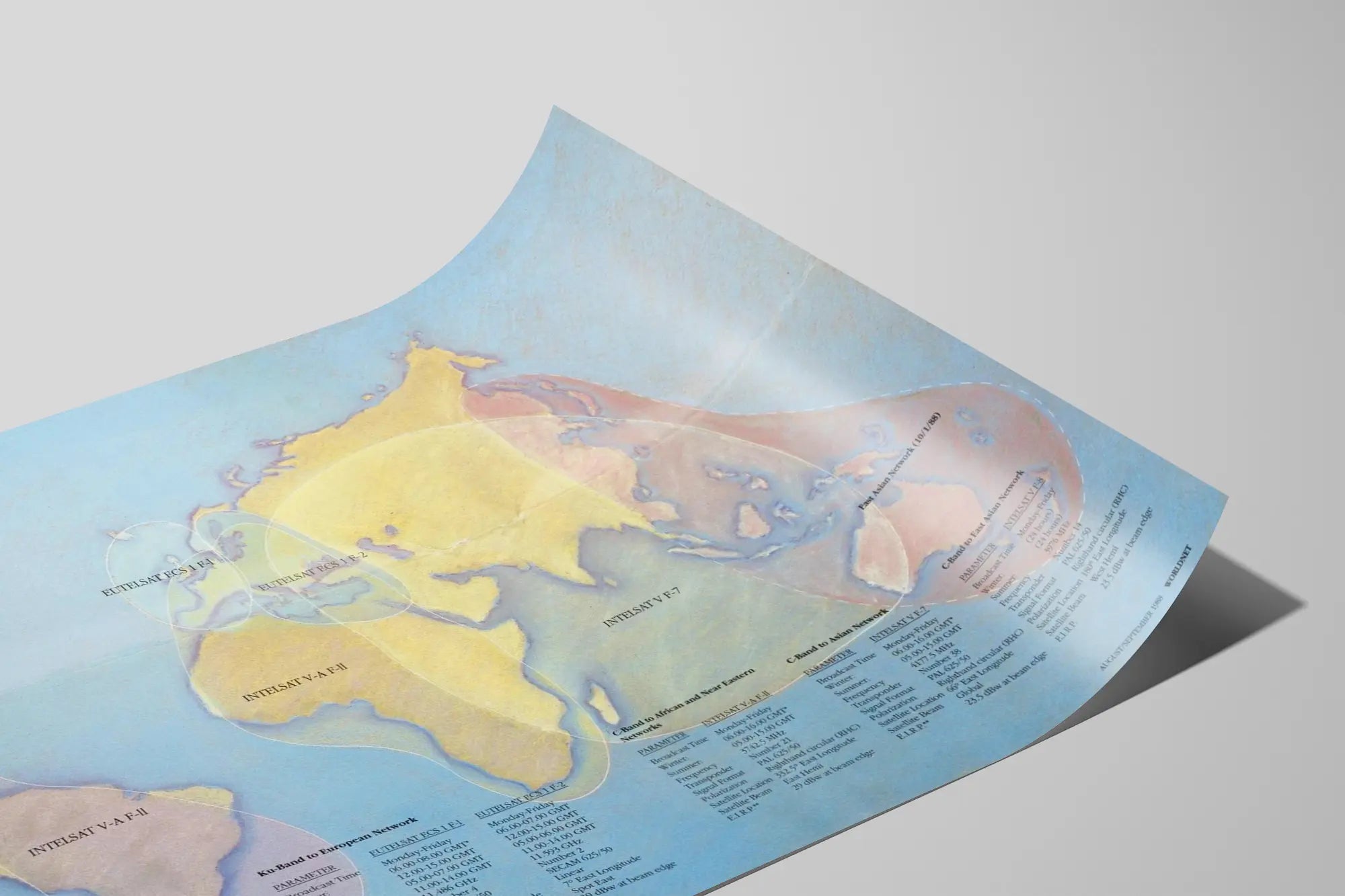 Idéal pour les amateurs de décoration murale originale et technique, ce poster vieux de plusieurs décennies met en avant les réseaux satellites majeurs utilisés à la fin des années 80. On y voit notamment les couvertures des satellites INTELSAT V-A F-II, EUTELSAT ECS 1 F-1 et F-2, INTELSAT V F-7, et INTELSAT F-8, chacun présenté avec ses caractéristiques précises telles que la fréquence, le transpondeur, la polarisation, la localisation au-dessus de la Terre et les plages horaires de diffusion. Chaque réseau est présenté avec une typographie fine en noir, idéalement visible sur le fond pastel bleu et jaune de la carte.