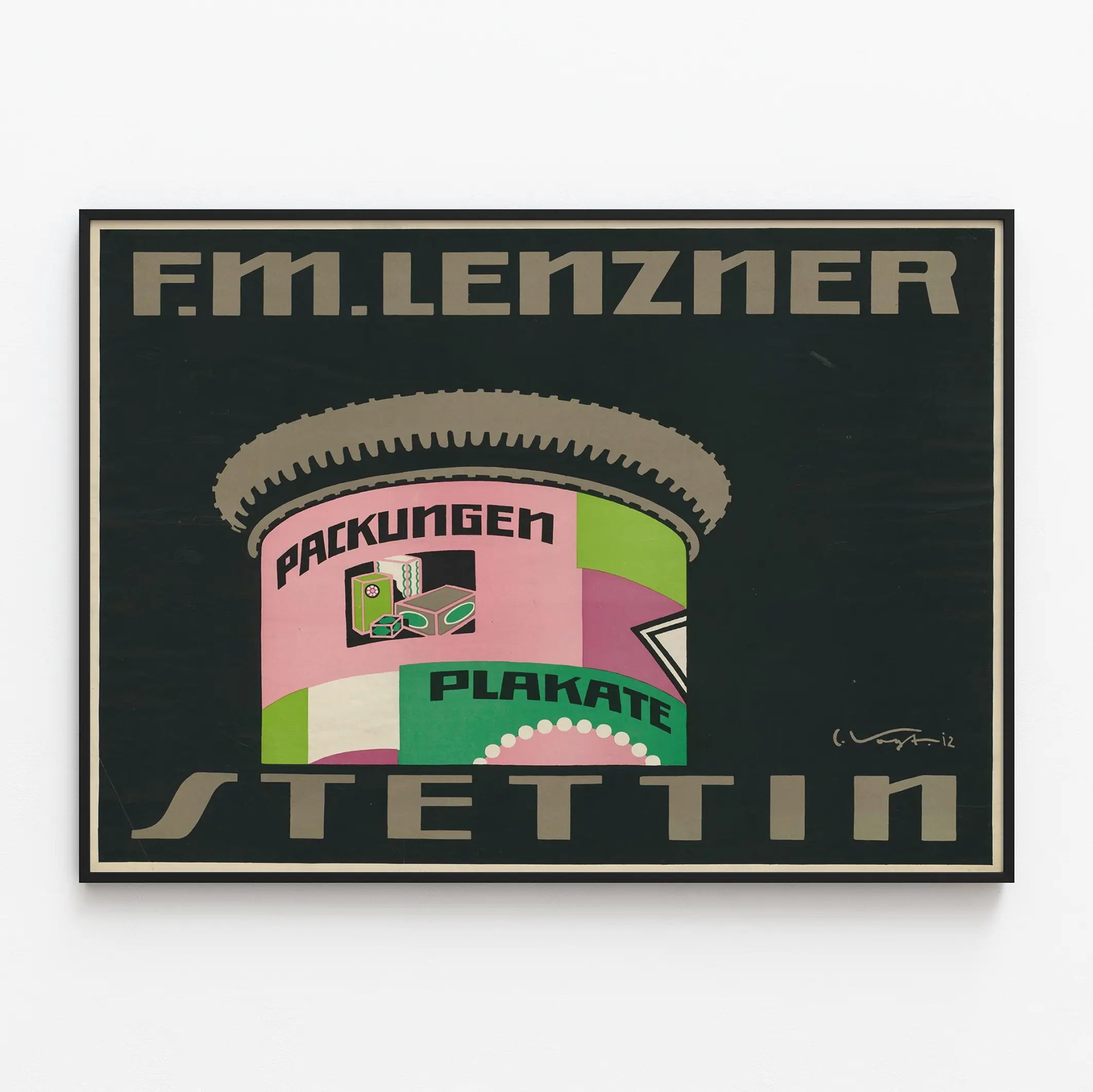 Découvrez cet affichage mural vintage au design graphique marqué et coloré, idéal pour apporter une touche rétro et artistique à votre décoration intérieure. Ce poster met en avant une illustration évoquant une colonne Morris publicitaire, avec des panneaux colorés affichant les mots "Packungen" et "Plakate", suggérant un univers lié à l'emballage et à l'affichage. Au centre, des formes géométriques en rose, vert et violet attirent le regard, dynamisant l'ensemble avec un style typique des années industrielles ou art déco. Le fond noir profond accentue la visibilité des couleurs vives tout en garantissant un contraste élégant, parfait pour un tableau décoratif dans un salon, un bureau ou une salle d'exposition. Le texte "F. M. Lenzner" en haut et "Stettin" en bas encadrent l’illustration, apportant une note d'authenticité et d’histoire à cette pièce graphique. Cette décoration murale est idéale pour les amateurs de posters aux influences vintage, urbanistiques et industrielles. Son esthétique épurée et ses formes stylisées en font un élément décoratif incontournable pour personnaliser un mur avec charme et caractère. Que ce soit pour un intérieur contemporain où le mélange des styles est à l’honneur, ou une ambiance plus classique où le vintage se fait roi, ce poster offre une qualité visuelle saisissante. Cette affiche murale se prête aussi bien à la mise en valeur dans une galerie d’art qu’à une intégration dans un espace privé cherchant à dévoiler un goût prononcé pour le design graphique historique.