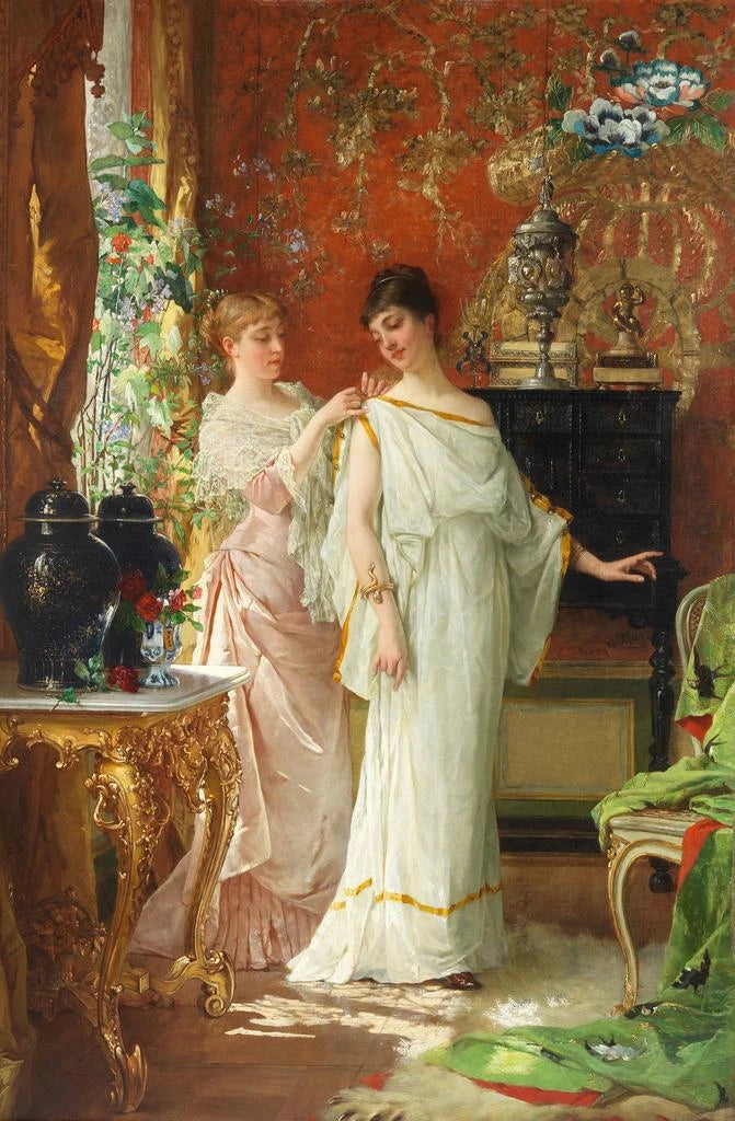 In "Préparatifs", Jan Verhas ci immerge in un'atmosfera intima dove la luce soffice accarezza i volti dei personaggi. La composizione, centrata su una donna intenta a preparare un'attività, evoca una tranquillità e un'armonia che invitano alla contemplazione. I colori pastello, dominati da tonalità calde, creano una sensazione di calore e comfort. La tecnica di Verhas, che mescola realismo e tocchi impressionisti, dà vita a ogni dettaglio, dai drappeggi dei vestiti alle espressioni delicate dei volti. Quest'opera è una vera ode alla vita quotidiana, catturando un momento fugace con grande sensibilità.