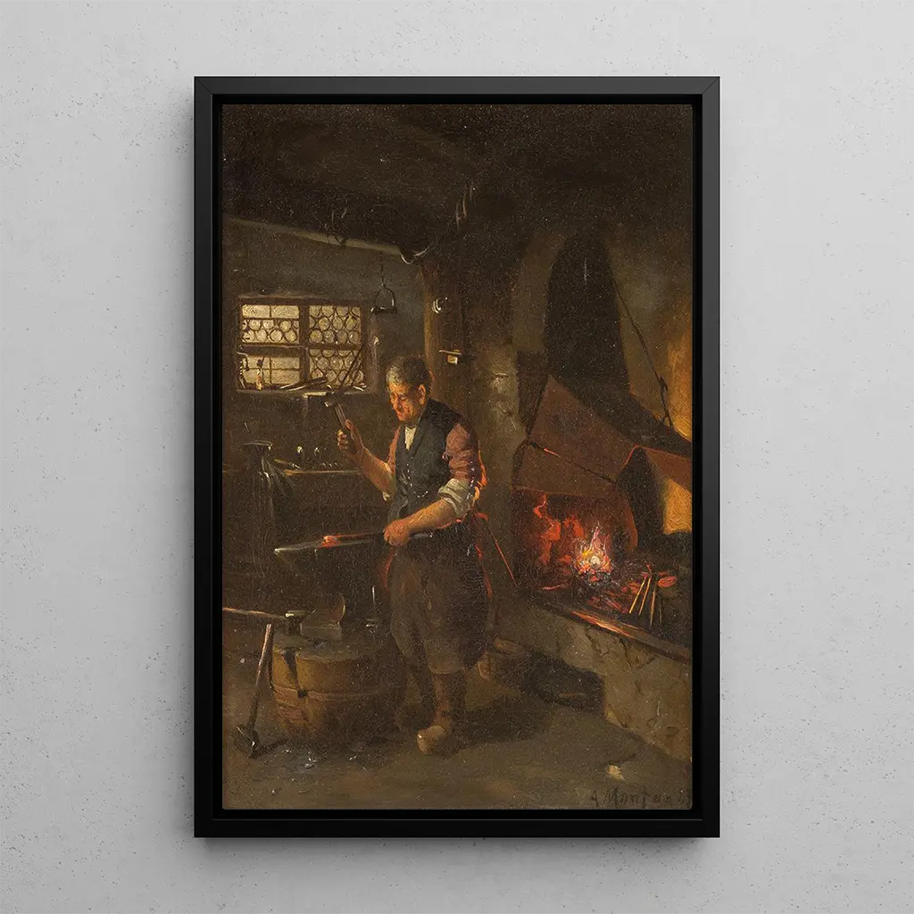 Chez le forgeron : une scène de vie empreinte de rusticité Dans "Chez le forgeron", Anders Olsson Montan nous plonge au cœur d'un atelier où la chaleur du feu et le bruit du métal en fusion créent une atmosphère vibrante. La composition met en avant le forgeron, figure centrale, dont les gestes précis et puissants sont magnifiés par des couleurs chaudes et terreuses. Les ombres dansantes et la lumière filtrée ajoutent une dimension presque tactile à cette scène de vie quotidienne. Montan réussit à capturer non seulement l'activité artisanale, mais aussi l'essence même de la vie rurale, où le travail manuel est synonyme de savoir-faire et de tradition. Anders Olsson Montan : un témoin de la vie scandinave Anders Olsson Montan, peintre suédois du début du XXe siècle, est connu pour ses représentations de la vie rurale et des métiers traditionnels. Influencé par le mouvement réaliste, Montan s'attache à dépeindre des scènes authentiques qui reflètent l'âme de la Suède. Son œuvre, souvent empreinte de nostalgie, témoigne d'une époque où les artisans et les paysans formaient le cœur de la société. En explorant les thèmes de la nature et du travail, Montan contribue à la préservation d'un héritage culturel, tout en s'inscrivant dans une tradition artistique qui valorise le quotidien. Une acquisition décorative aux multiples atouts La reproduction de "Chez le forgeron" est une pièce décorative qui saura enrichir votre intérieur, que ce soit dans un salon, un bureau ou une chambre. Avec sa qualité d'impression fidèle et ses couleurs chaleureuses, ce tableau apporte une touche d'authenticité et de charme rustique à votre décoration. Son attrait esthétique réside dans la capacité à évoquer des émotions et à raconter une histoire, transformant ainsi n'importe quel espace en un lieu de contemplation. Opter pour cette toile, c'est choisir d'intégrer une œuvre qui célèbre le travail et la tradition, tout en s'harmonisant parfaitement avec divers styles d'intérieur.