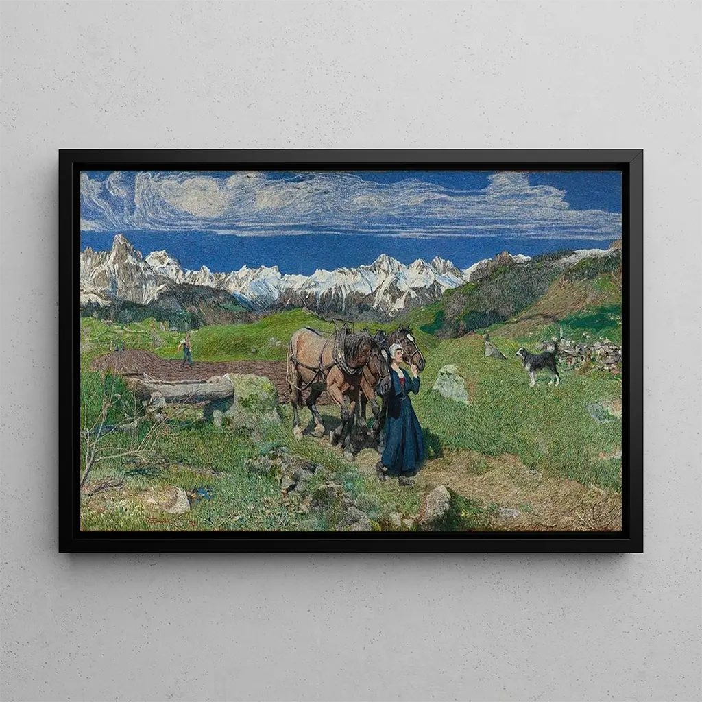 Primavera nelle Alpi: un soffio di vita e di luce La stampa d'arte di "Primavera nelle Alpi" di Giovanni Segantini evoca un'esplosione di colori e di luce, catturando l'essenza stessa del rinnovamento primaverile. Le maestose montagne, bagnate dal sole, si ergono sullo sfondo, mentre la flora alpina sboccia in un festival di tonalità vibranti. Segantini, con la sua tecnica divisionista, utilizza tocchi di colore affiancati per creare una luminosità unica, dando vita a questa scena idilliaca. I personaggi, in armonia con il loro ambiente, sembrano celebrare la bellezza della natura, invitando lo spettatore a sentire la gioia e la vitalità di questa stagione. Giovanni Segantini: il poeta della luce Giovanni Segantini, nato nel 1858, è un artista principale del movimento simbolista e del divisionismo. Influenzato dai paesaggi alpini della sua infanzia, ha dedicato la sua carriera a esplorare la relazione tra l'uomo e la natura. Segantini è riuscito a trascendere il semplice paesaggio per farne un vero poema visivo, dove la luce e il colore giocano un ruolo fondamentale. La sua ricerca di spiritualità attraverso la natura e il suo impegno verso la rappresentazione della vita contadina hanno segnato la sua epoca, rendendolo una figura emblematica della pittura alpina e un precursore dell'arte moderna. Un acquisto decorativo con molteplici vantaggi La stampa d'arte di "Primavera nelle Alpi" è un pezzo decorativo che porterà un tocco di freschezza e dinamismo nel vostro interno. Che sia in un soggiorno, in uno studio o in una camera da letto, questa opera illuminerà il vostro spazio con i suoi colori vivaci e la sua composizione armoniosa. La qualità di stampa garantisce una fedeltà notevole ai dettagli dell'opera originale, offrendo al contempo un'attrattiva estetica indiscutibile. Scegliendo questa tela, non vi limitate ad abbellire la vostra decorazione, ma invitate anche una parte della bellezza naturale delle Alpi nella vostra quotidianità, creando un ambiente ispirante e rilassante.