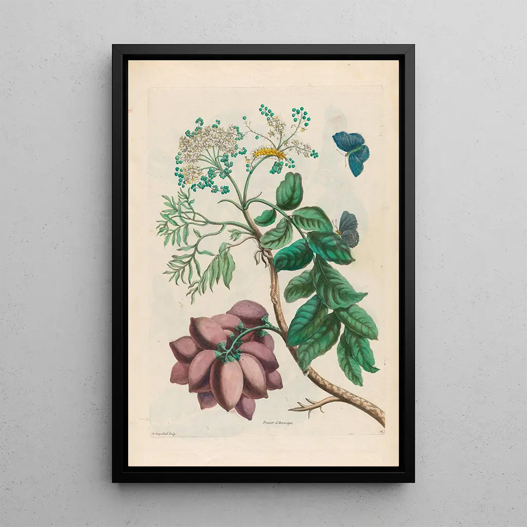 La stampa d'arte del Prunier d'Amérique, opera di Maria Sibylla Merian, ci trasporta in un mondo in cui la bellezza della natura viene valorizzata con un'eccezionale raffinatezza. Questa tela illustra con precisione i dettagli di questa pianta, i suoi fiori delicati e i suoi colori vibranti. Le tonalità di viola e bianco si mescolano armoniosamente, creando un'atmosfera dolce e rilassante. La tecnica della calcografia, utilizzata da Merian, permette di catturare la texture e la forma degli elementi naturali, offrendo allo spettatore un invito a esplorare le meraviglie della botanica.