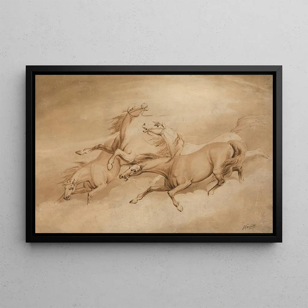 Quattro Cavalli al Galoppo: una danza selvaggia sulla tela In questa opera iconica, Quattro Cavalli al Galoppo, Samuel Howitt cattura la potenza e la grazia di questi animali maestosi. I cavalli, rappresentati in un movimento dinamico, sembrano quasi sollevarsi da terra, con i muscoli tesi e la criniera al vento. La palette di colori, dominata da caldi marroni e tocchi di bianco brillante, crea un'atmosfera vibrante e vivace. La tecnica dell'artista, mescolando acquerello e disegno, dà un'impressione di leggerezza e fluidità, trasportando lo spettatore in un mondo in cui la natura regna sovrana. Samuel Howitt: un testimone della natura selvaggia Samuel Howitt, attivo all'inizio del XIX secolo, è conosciuto per le sue rappresentazioni della fauna e della flora britanniche. Influenzato dai paesaggi naturali e dalla vita selvatica, è riuscito a catturare lo spirito della sua epoca, segnata da un crescente interesse per la natura e l'esplorazione. Le sue opere, spesso intrise di romanticismo, testimoniano di un'epoca in cui l'uomo iniziava a riscoprire e apprezzare la bellezza del mondo naturale. Howitt è stato anche un illustratore prolifico, contribuendo a opere sulla storia naturale, il che ha rafforzato il suo status di artista rispettato nel campo. Un acquisto decorativo con molteplici vantaggi La riproduzione di Quattro Cavalli al Galoppo è una scelta ideale per arricchire la vostra decorazione d'interni. Che si tratti di un soggiorno, di un ufficio o di una camera da letto, questa stampa d'arte apporterà un tocco di eleganza e dinamismo al vostro spazio. La qualità di stampa garantisce una fedeltà ai dettagli originali, permettendo di percepire tutta la potenza dell'opera di Howitt. Con il suo indiscusso fascino estetico, questa tela saprà conquistare i vostri ospiti e diventare un argomento di conversazione, aggiungendo un tocco di raffinatezza alla vostra decorazione.