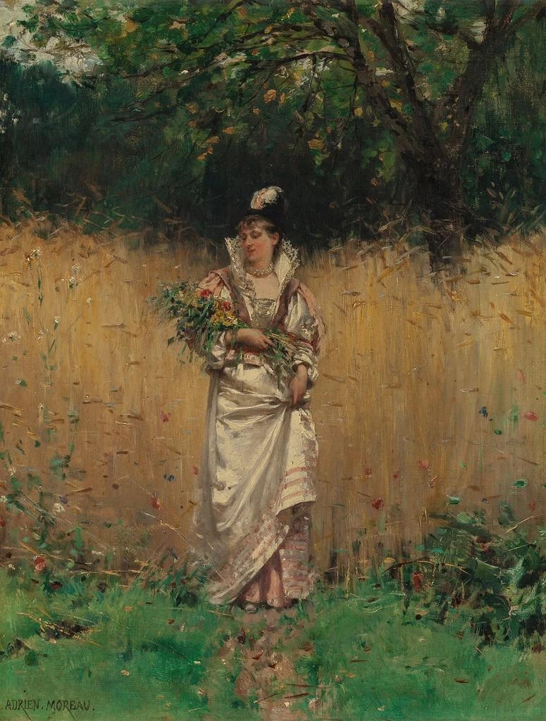 Lo stile di Adrien Moreau si caratterizza per un realismo sottile, in cui ogni dettaglio è accuratamente osservato e riprodotto con una precisione senza pari. In "Cueillette de fleurs sauvages", l'artista utilizza una palette di colori vivaci e naturali, che richiamano le sfumature cangianti dei fiori e della vegetazione circostante. I giochi di luce e ombra, abilmente orchestrati, conferiscono alla scena una profondità sorprendente, invitando l'occhio a esplorare ogni angolo dell'opera. La composizione, al tempo stesso dinamica e armoniosa, testimonia di un equilibrio perfetto tra gli elementi, dove le figure umane si fondono con grazia nel paesaggio floreale. Questa simbiosi tra uomo e natura incarna una visione artistica profondamente radicata nel romanticismo, aprendo anche a influenze impressioniste emergenti in quel periodo.