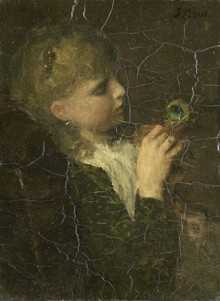 Jacob Maris, peintre néerlandais du XIXe siècle, est reconnu pour ses contributions au mouvement impressionniste. Né en 1837, il a été influencé par les grands maîtres de son temps, tels que Frans Hals et Rembrandt, tout en développant son propre style unique. Maris a su capturer la lumière et l'atmosphère de ses sujets, qu'il s'agisse de paysages ou de portraits. Son travail est souvent associé à l'école de La Haye, qui privilégiait des thèmes de la vie quotidienne et des scènes intimistes. "Fille avec une plume de paon" illustre parfaitement son talent pour représenter la beauté fugace de la jeunesse.