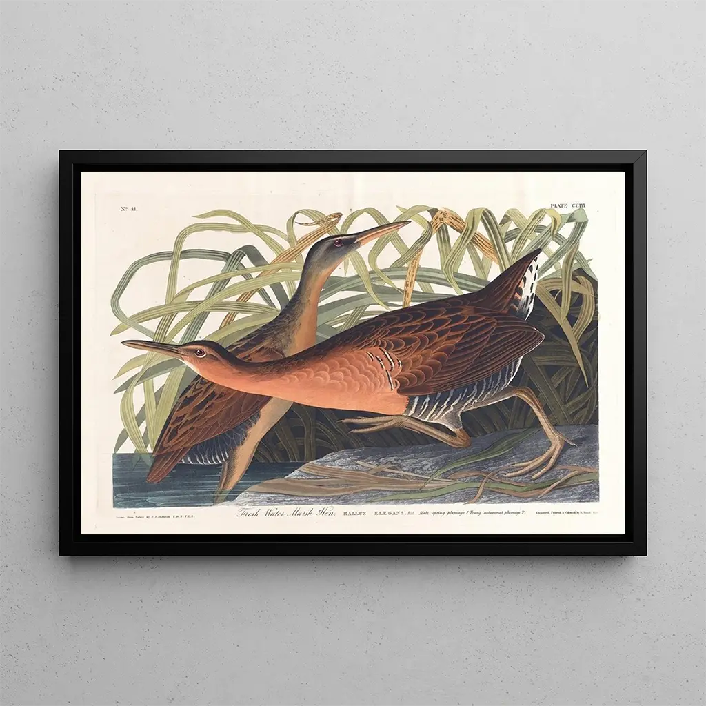 John James Audubon, né en 1785, est une figure emblématique du XIXe siècle, reconnu pour ses contributions à l'ornithologie et à la stampa d'arte naturaliste. Son œuvre s'inscrit dans le mouvement romantique, où la nature est célébrée dans toute sa splendeur. Influencé par ses voyages à travers les États-Unis, Audubon a su capturer la diversité des espèces aviaires avec une précision remarquable. Ses illustrations, dont Râle d'eau douce, sont non seulement des œuvres d'art, mais aussi des documents scientifiques précieux, témoignant de l'importance de la conservation de la nature à une époque où l'industrialisation commençait à prendre le pas sur les écosystèmes.