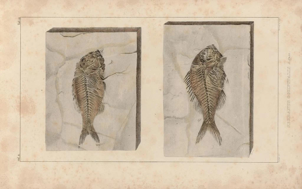 La stampa d'arte di Ricerca sui Pesci Fossili Pl. 374, realizzata da Louis Agassiz, ci trasporta in un mondo antico, dove i mari pullulavano di creature marine affascinanti. Questa illustrazione scientifica, allo stesso tempo precisa e artistica, mette in evidenza esemplari di pesci fossili con un'attenzione meticolosa ai dettagli anatomici. Le tonalità terrose e le sfumature delicate di grigio e beige evocano la fossilizzazione e il passare del tempo. Agassiz riesce a unire scienza ed estetica, offrendo una visione che suscita curiosità e meraviglia di fronte alla biodiversità scomparsa.